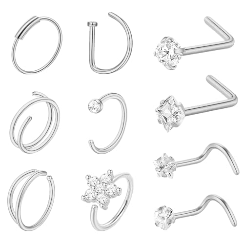 LOLIAS 12Pcs Silver Nose Ring Stud 316L Surgical Steel Nose Piercing Jewellery CZ Inlaid L-Shape Nose Studs Nose Screws Stainless Steel Nose Septum Rings Hoop Nose Piercings for Women Men 18/20G