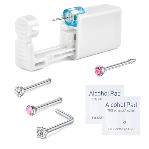 WillTen 6Pcs Nose Piercing Kit with Silver Nose Stud, 1Pack Nose Piercing Gun, Disposable Nose Piercing Kit with Straight L-Shape Nose Rings Stud Pink CZ Nose Piercings Gun Kit Tool