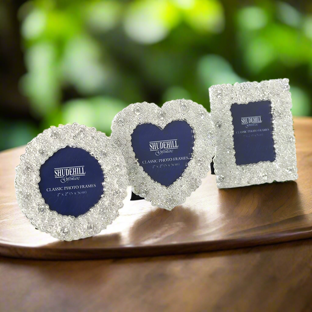 Set Of 3 Mini Diamanté Silver Photo Frames Heart, Round & Rectangle Set