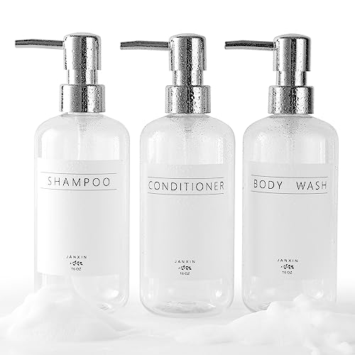 Janxin Shampoo and Conditioner Dispenser Set of 3,Modern Refillable 16oz Shampoo and Conditioner Bottles with Pump,Stylish Shower Soap Dispenser with Waterproof Labels for Bathroom(Clear)