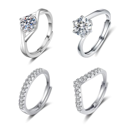 4Pcs Silver Rings for Women 925 Sterling Silver Open Ring Christmas Adjustable Cubic Zirconia Thumb Stacking Wedding Promise Rings Statement Ring Set Xmas Gifts for Surprise Party Jewellery Birthday