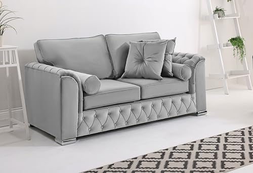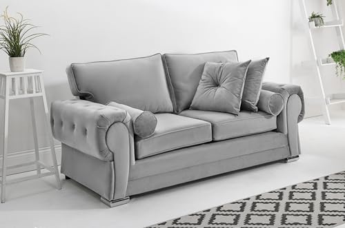 Sofahub Verona Silver Plush Velvet Sofa – 2 Seater, 3 Seater, 3+2 Seater or Corner Suite – Fullback Design, Button Tufted, Foam Cushions, Chrome Feet – Luxury Living Room Sofa Set (Silver, 3 Seater)