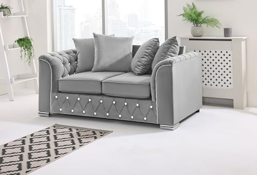 Sofahub Falcon Silver Plush Velvet Sofa – Diamond Studded Arms – Foam Seat Cushions – Button Tufted Detailing – 2 Seater, 3 Seater, 3+2 Set, Armchair & Corner Sofa Options (Silver, 2 Seater)