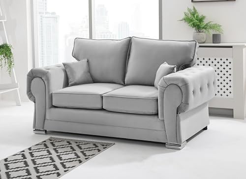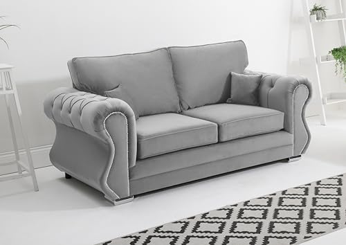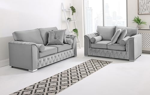 Sofahub Verona Silver Plush Velvet Sofa – 2 Seater, 3 Seater, 3+2 Seater or Corner Suite – Fullback Design, Button Tufted, Foam Cushions, Chrome Feet – Luxury Living Room Sofa Set (Silver, 2 Seater)