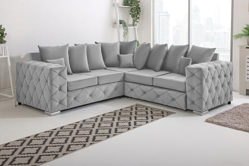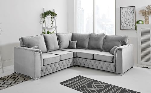 Sofahub Verona Silver Plush Velvet Sofa – 2 Seater, 3 Seater, 3+2 Seater or Corner Suite – Fullback Design, Button Tufted, Foam Cushions, Chrome Feet – Luxury Living Room Sofa Set (Silver, Corner)