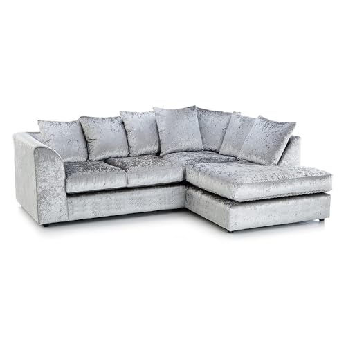 Furnishings For Less UK New Silver Crushed Velvet Corner Sofa 3 4 Seater | Crystal Range Right Hand Facing (Silver, Right Hand Facing)