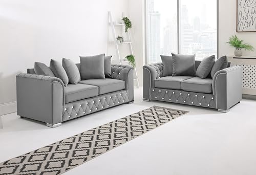 Sofahub Olympia Silver Plush Velvet Chesterfield Sofa – Diamond Detailing & Foam Seat Cushions – Available in 2 Seater, 3 Seater, 3+2, Corner & Corner with Diamonds (Silver, 3 + 2 Sofa Set)