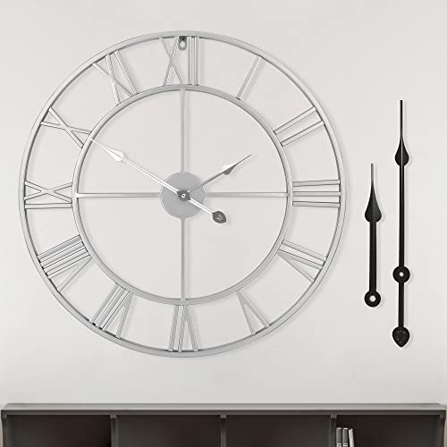 HAITANG 60CM Retro Silver Metal Large Wall Clock Roman Style Round Nearly Silent Little Ticking Battery Operated Roman Numerals Clocks for Living Room,Bedroom,Kitchen Decor
