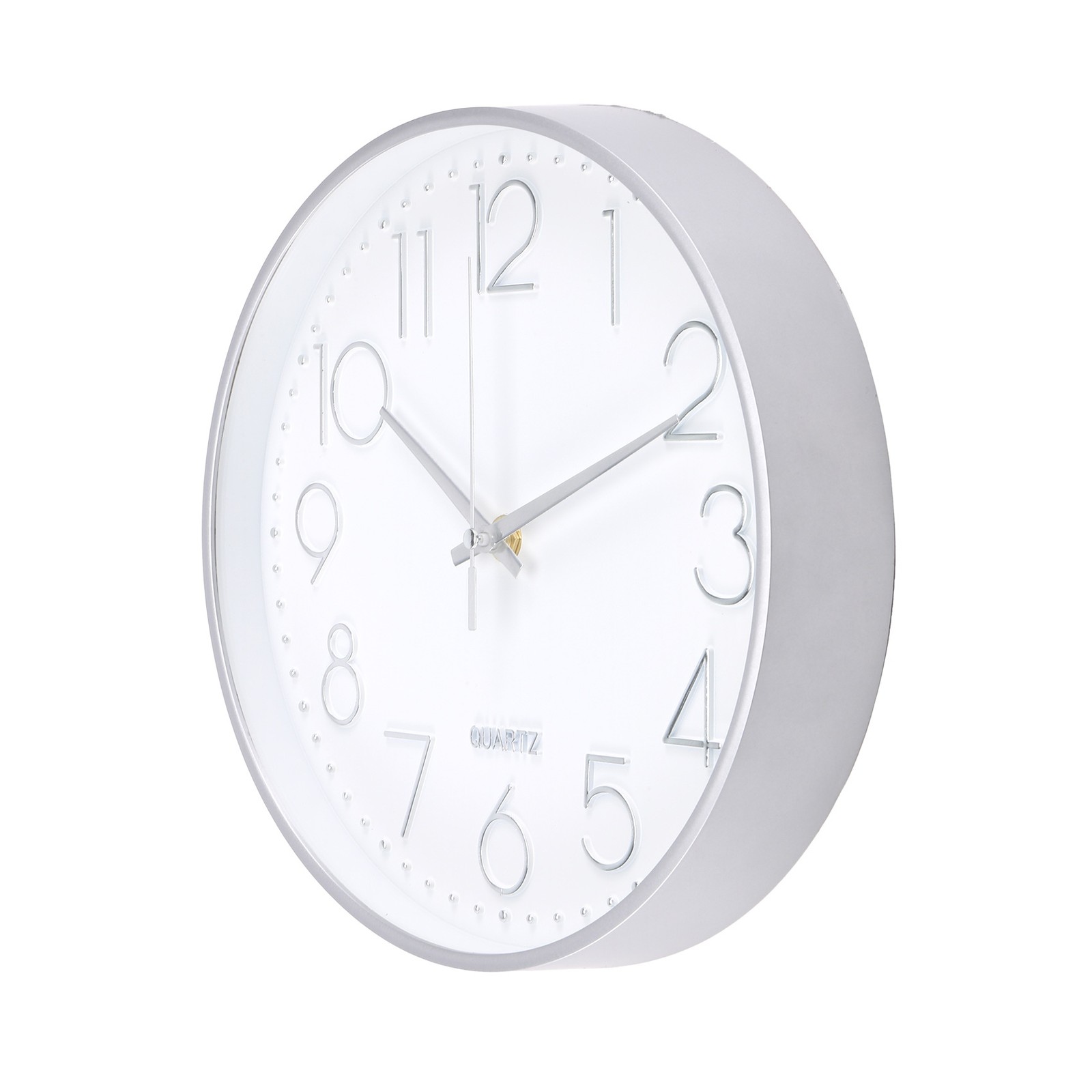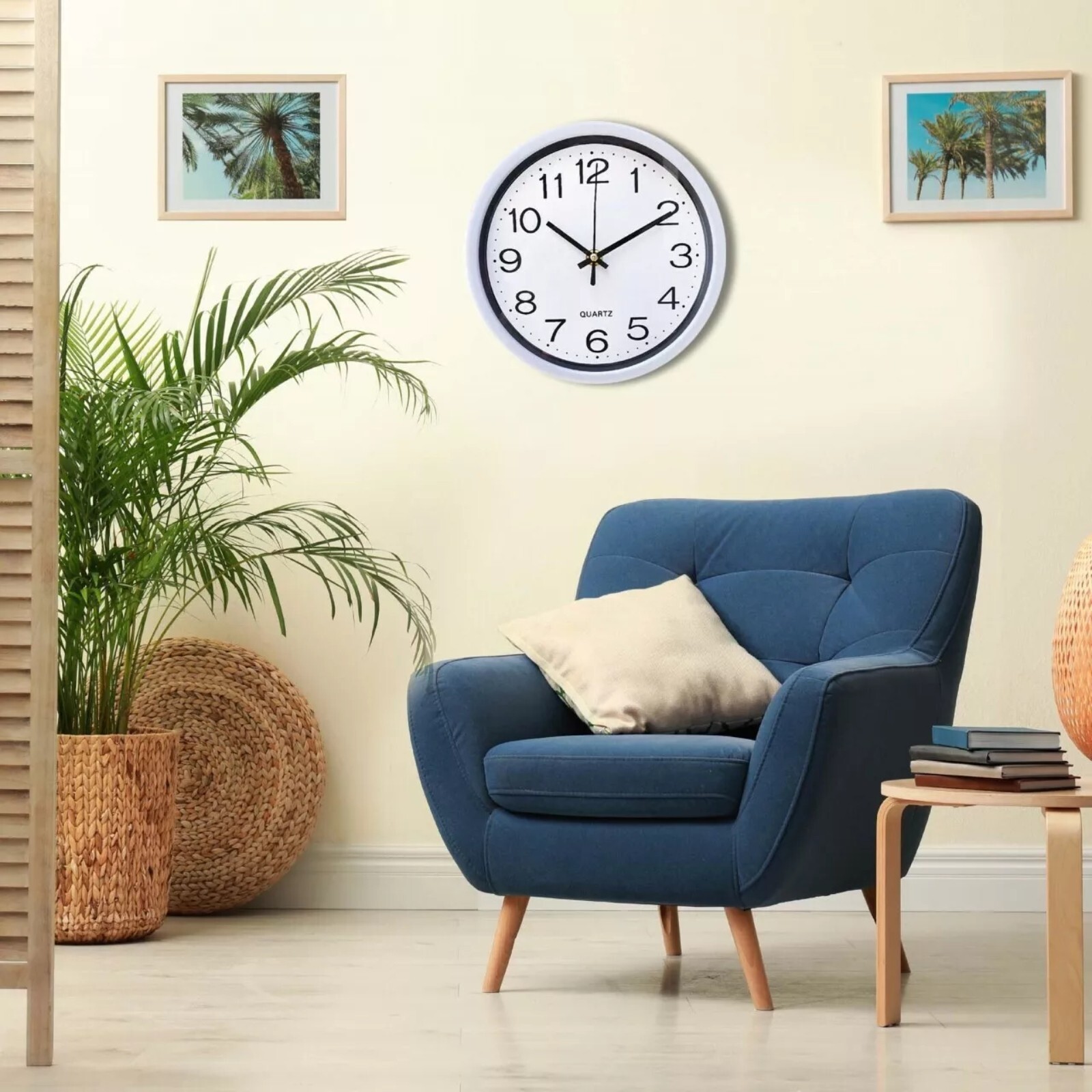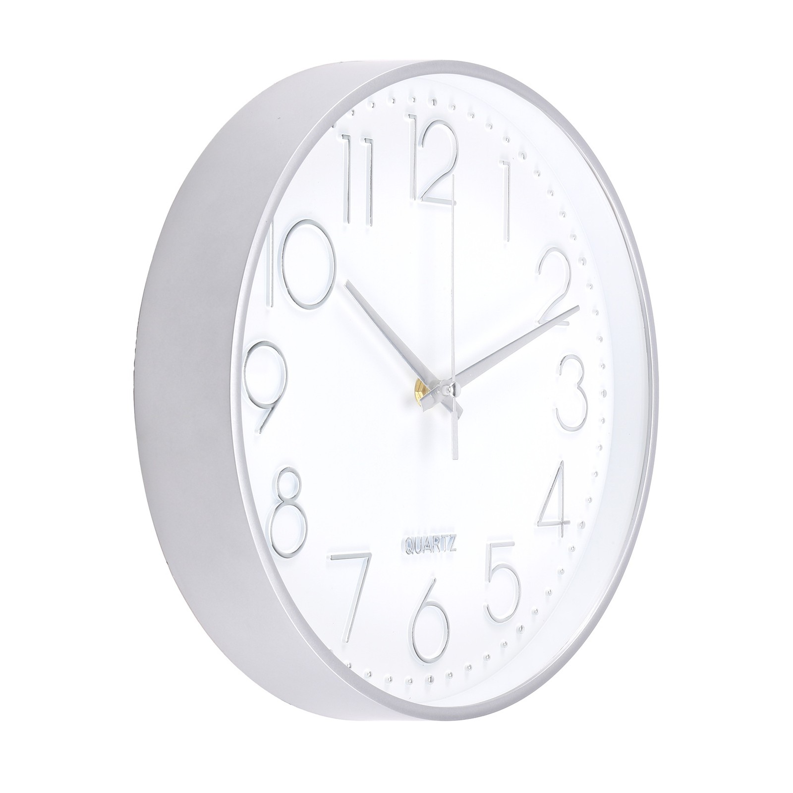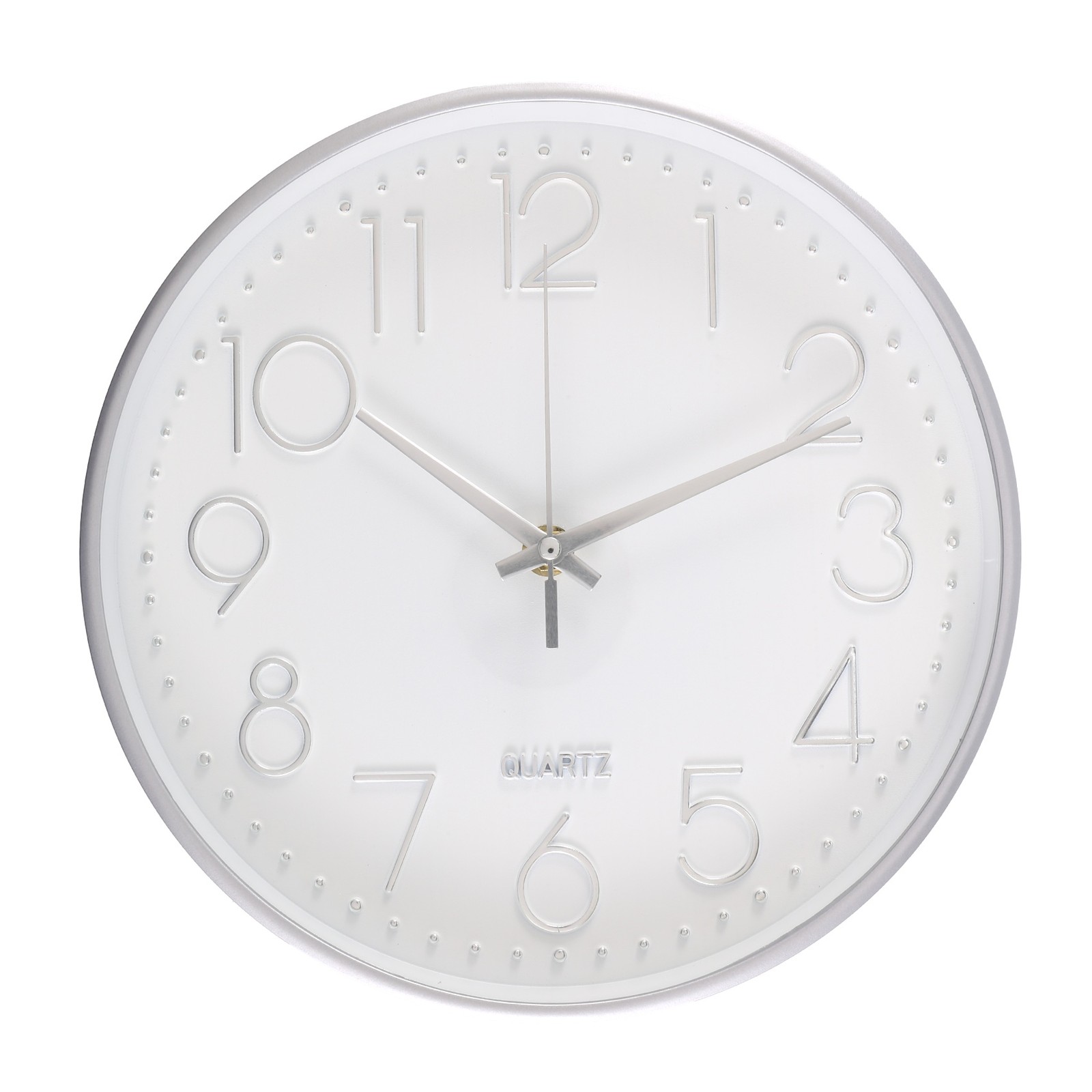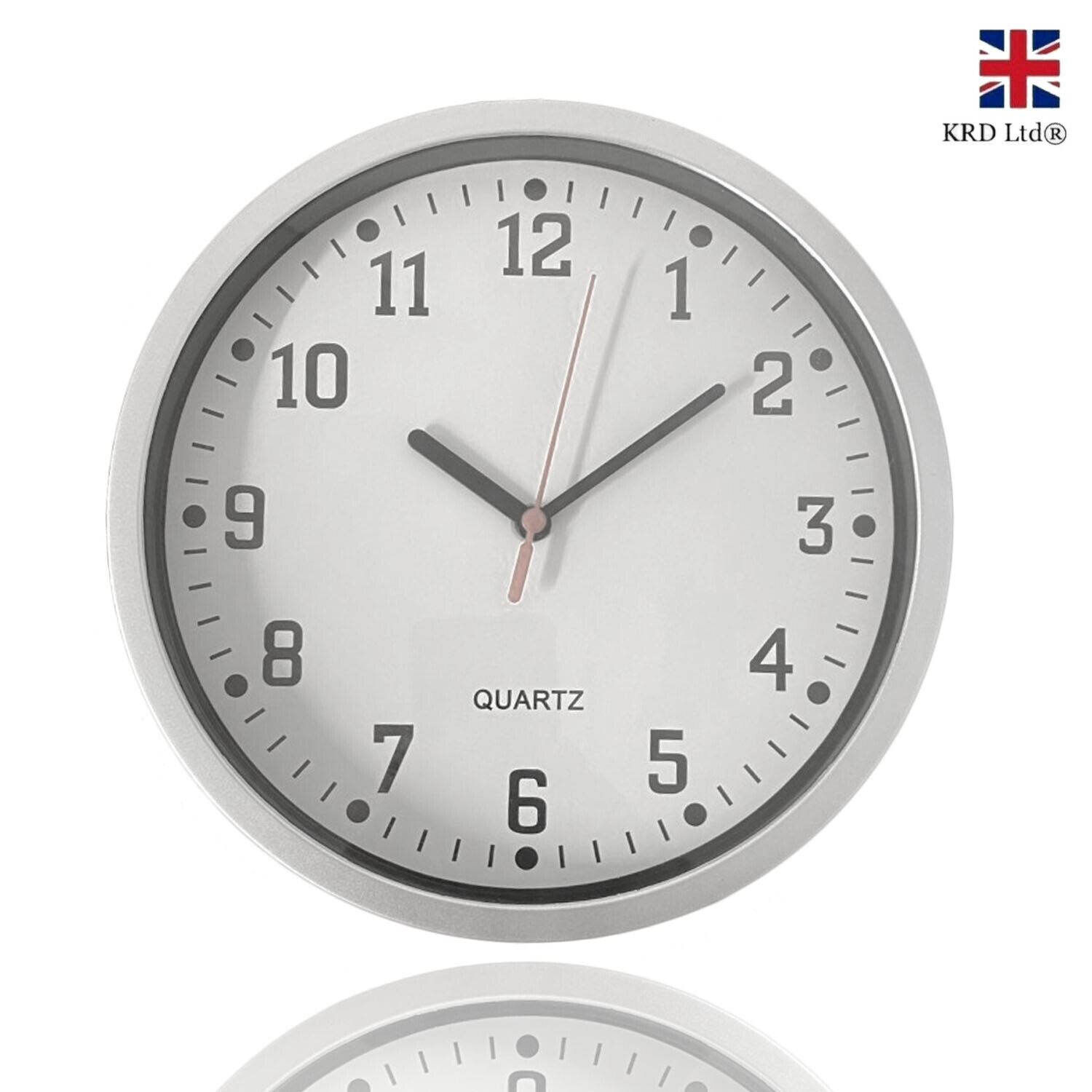 White Silver Round Wall Clock Quartz 22cm Large Numbers Kitchen Bedroom Home