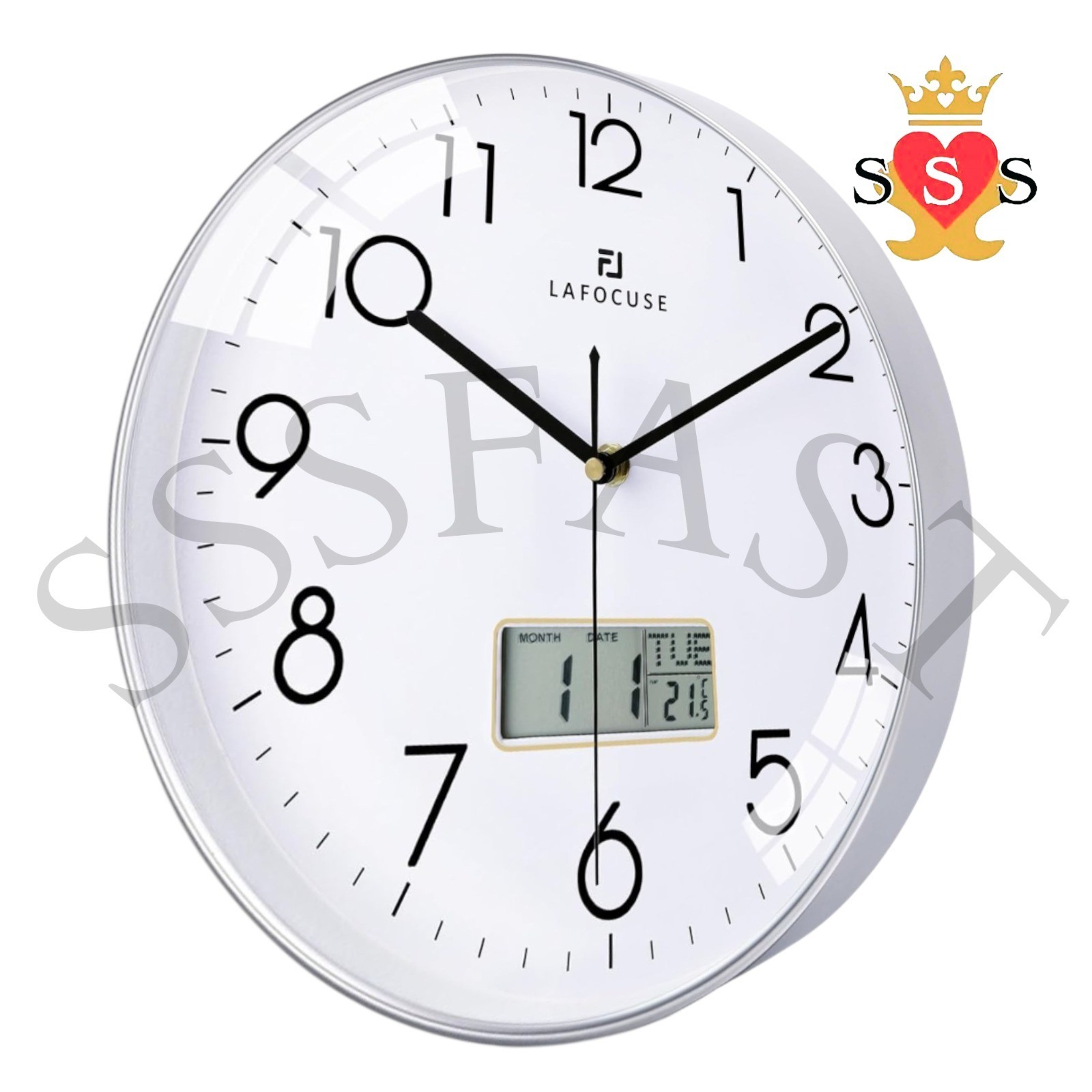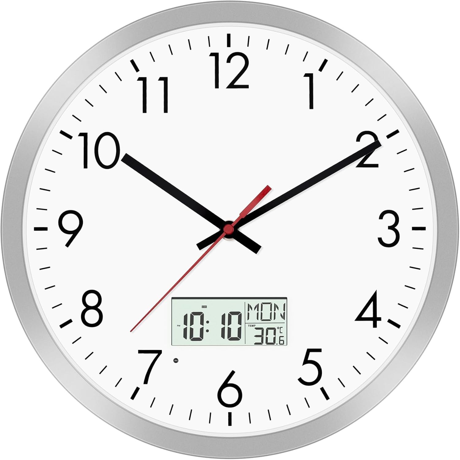 Lafocuse 12 Inch Silent Silver Wall Clock with Date and Day, Temperature, Day o