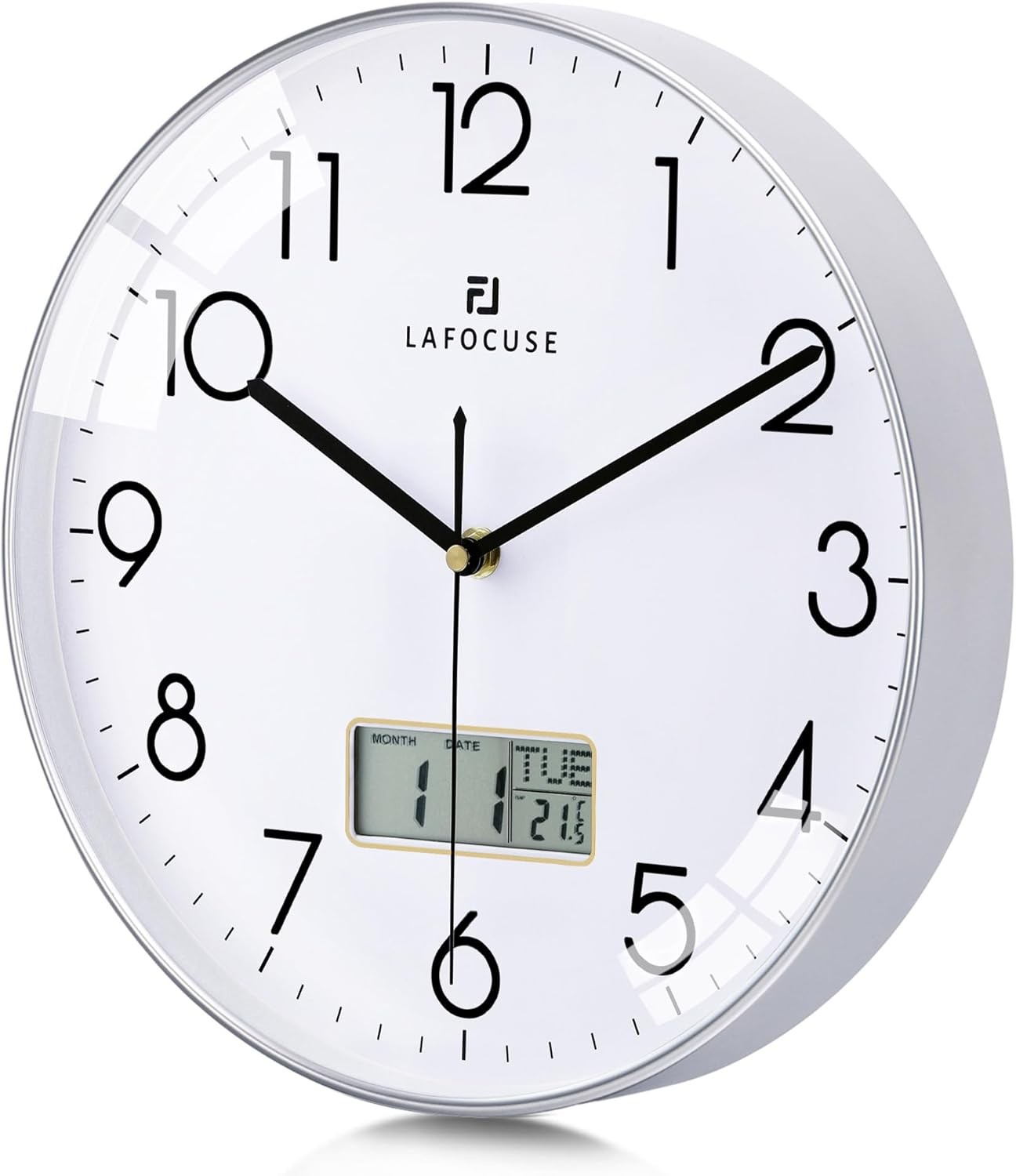 Lafocuse 12 Inch Silent Silver Wall Clock with Date and Day, Temperature, Day of Week, Kitchen Wall Clocks for Living Room Modern, LCD Digital Wall Clock Battery Operated Office Bedroom