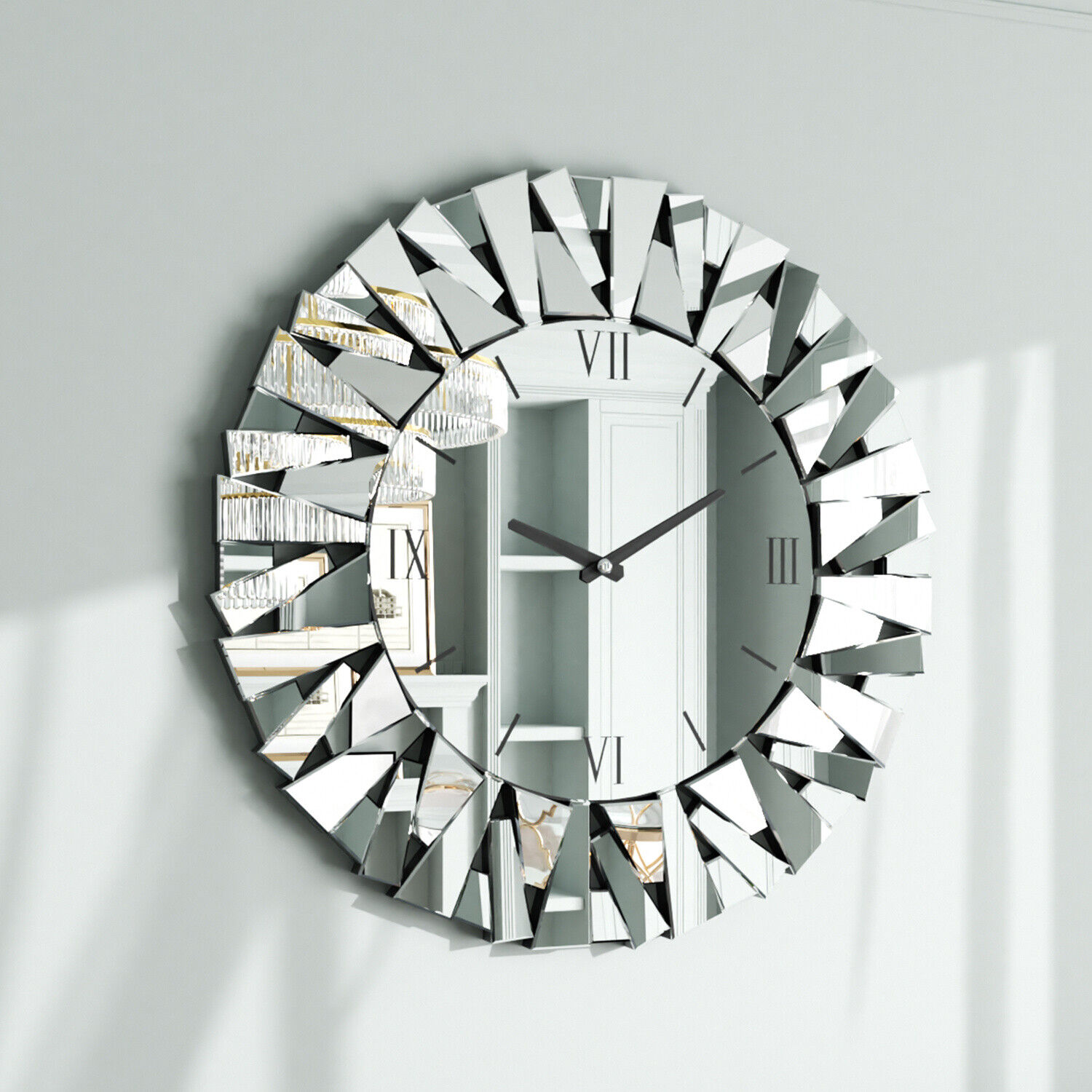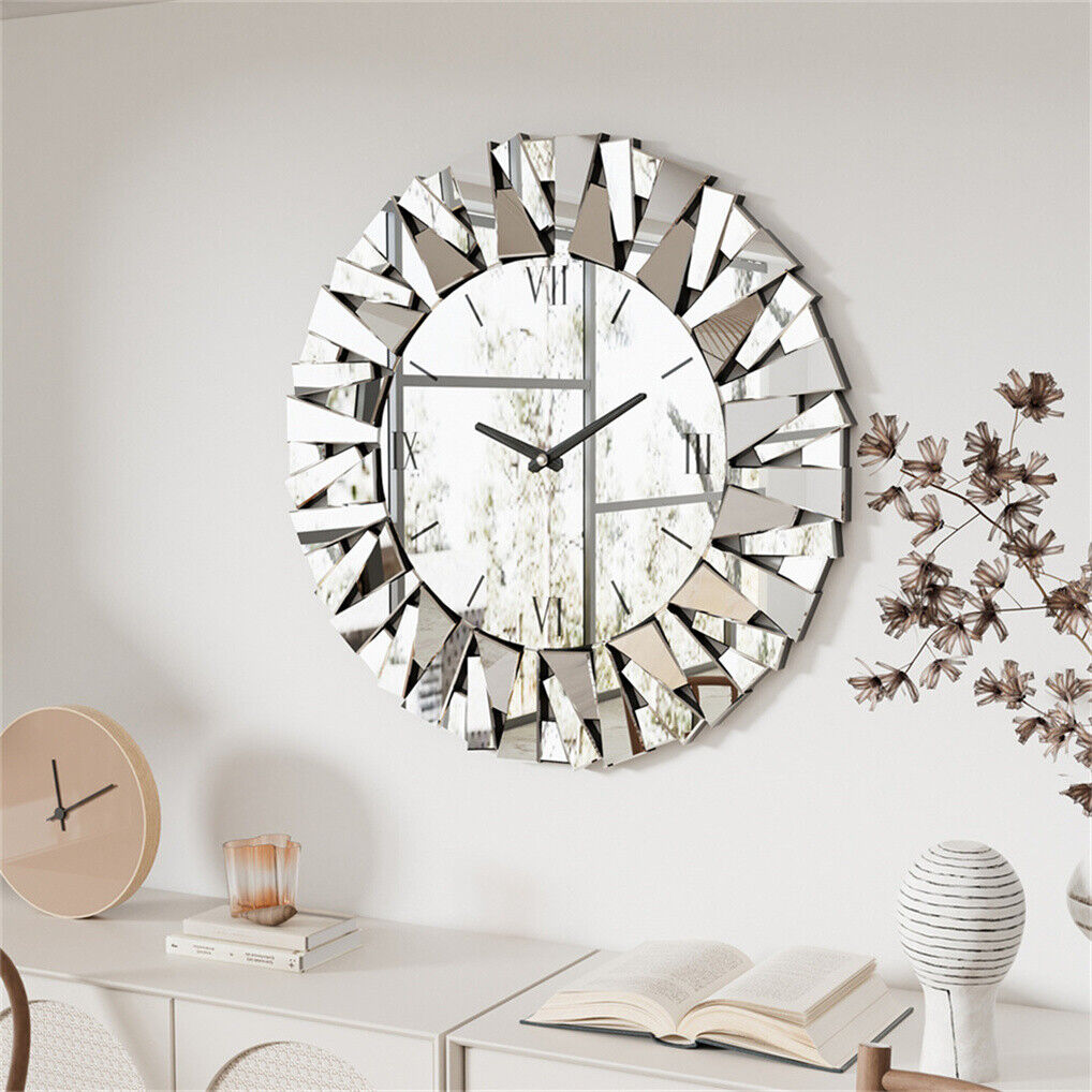 LUVODI Round Silver Wall Clock Large Mirrored Clock 3D Sunburst Beveled Framed