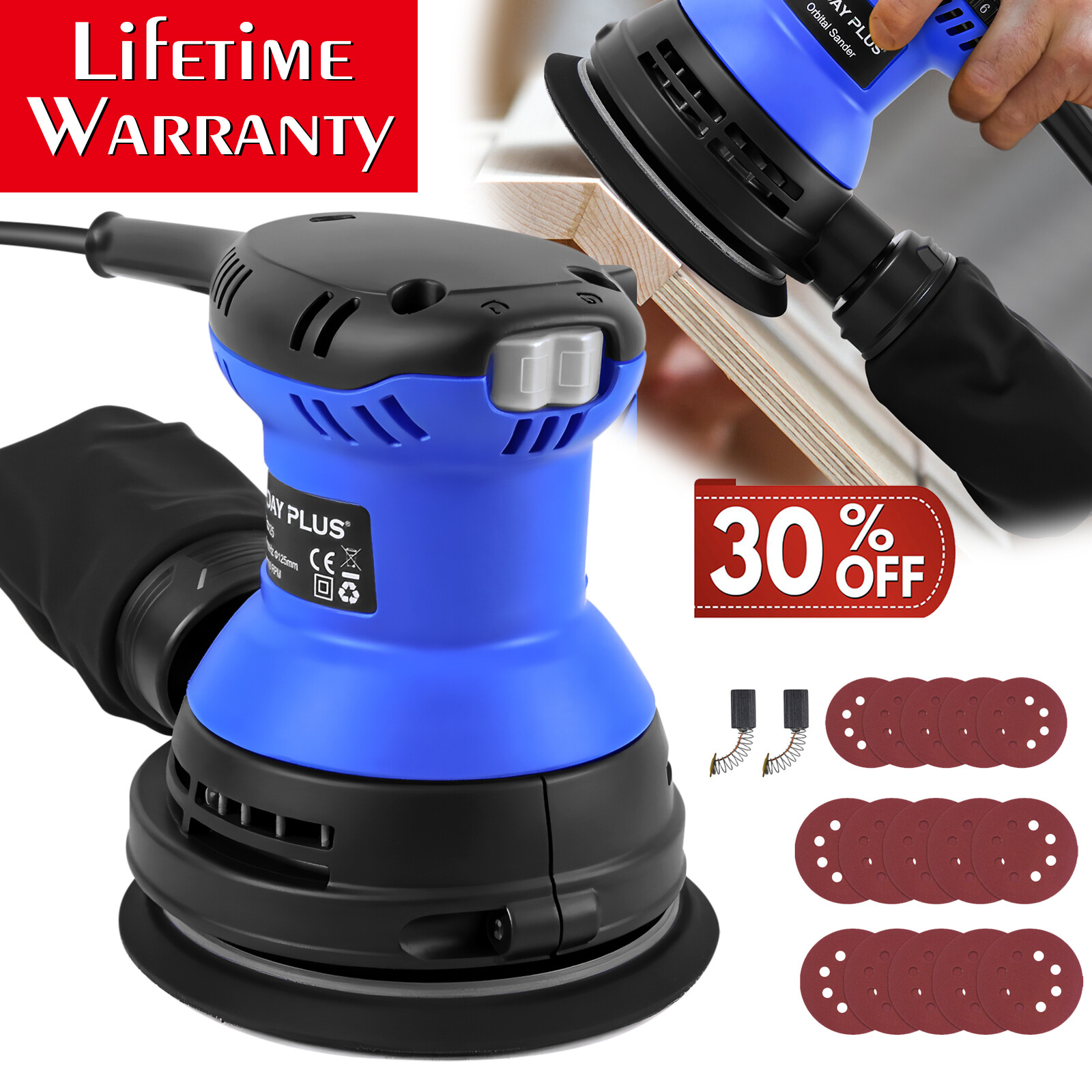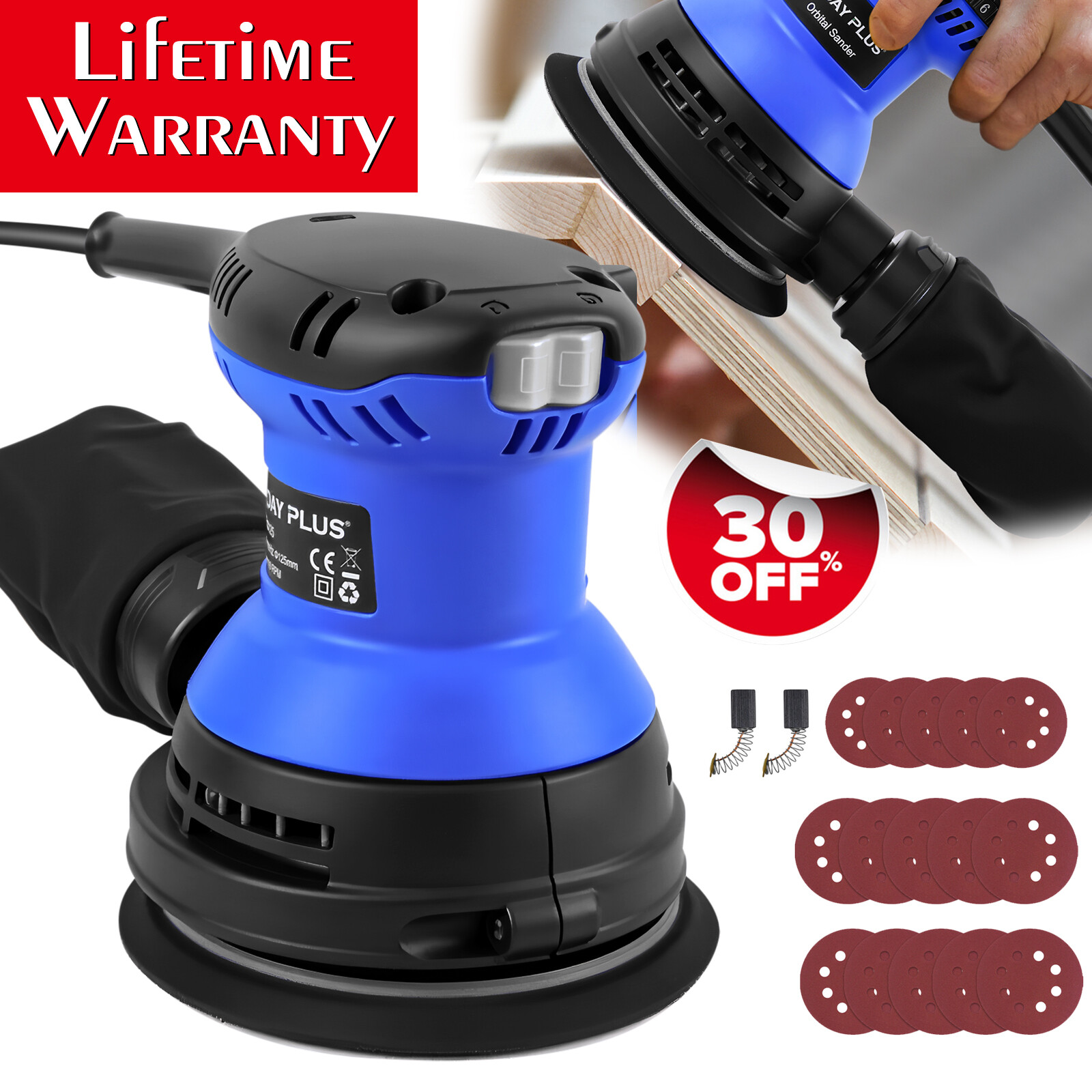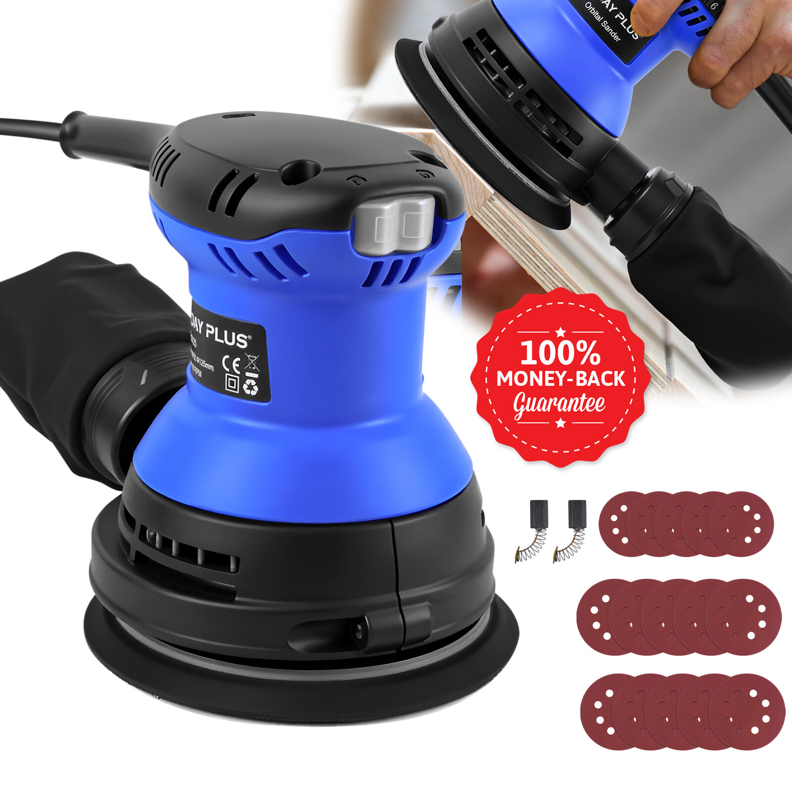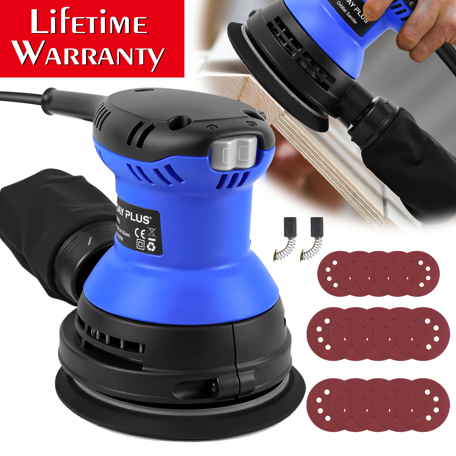 6-Speed Electric Random Orbital Palm Sander 125mm + Dust Bag +15pcs Sandpapers
