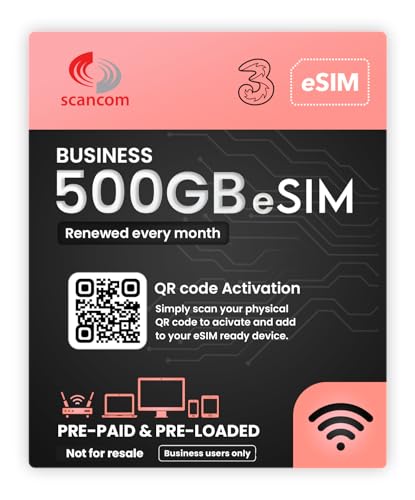 Three 500GB e-SIM Preloaded EVERY MONTH from now until 8th OCTOBER 2025 - Perfect for eSIM compatible Mobile Phones - Access to Three & Vodafone - Connects to the Strongest Signal available