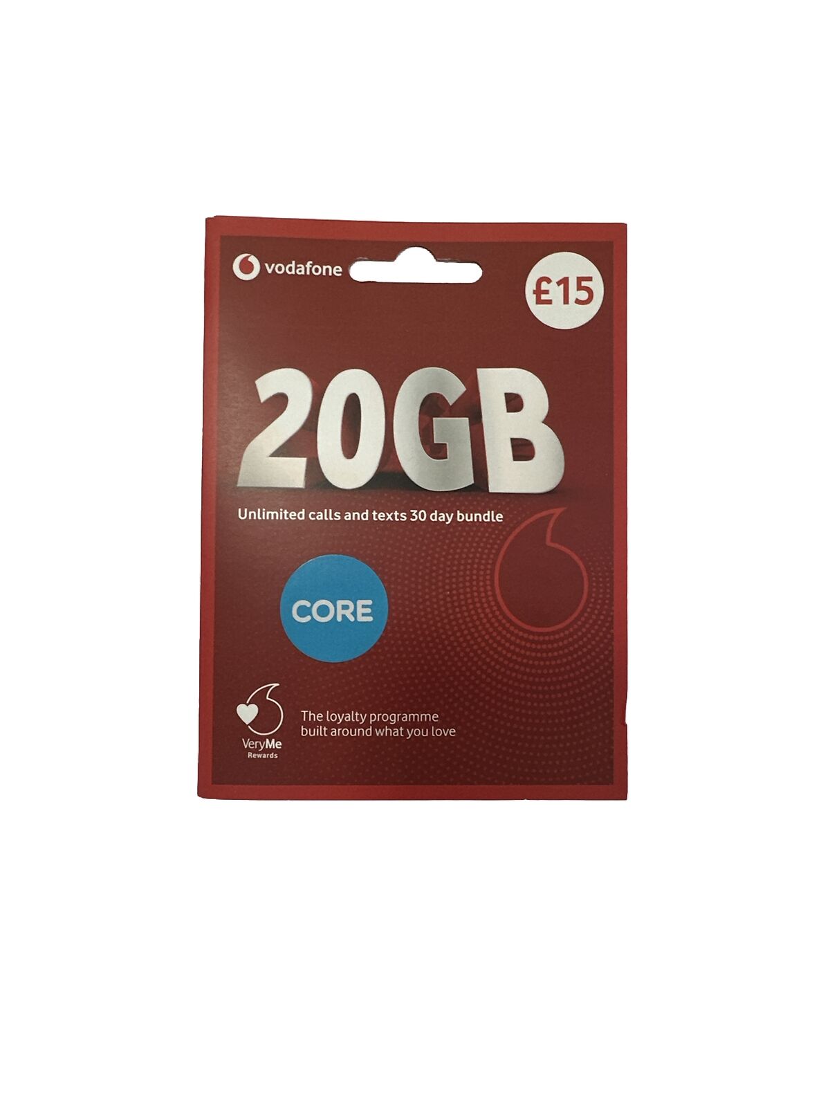 New Vodafone Rollover PAYG SIM Card Unltd calls txts 20GB £15 *NB ZERO CREDIT*