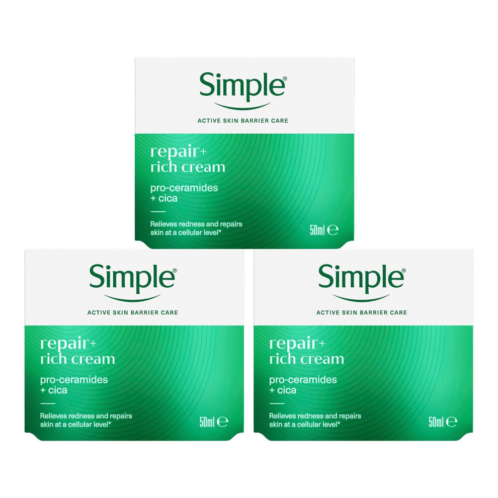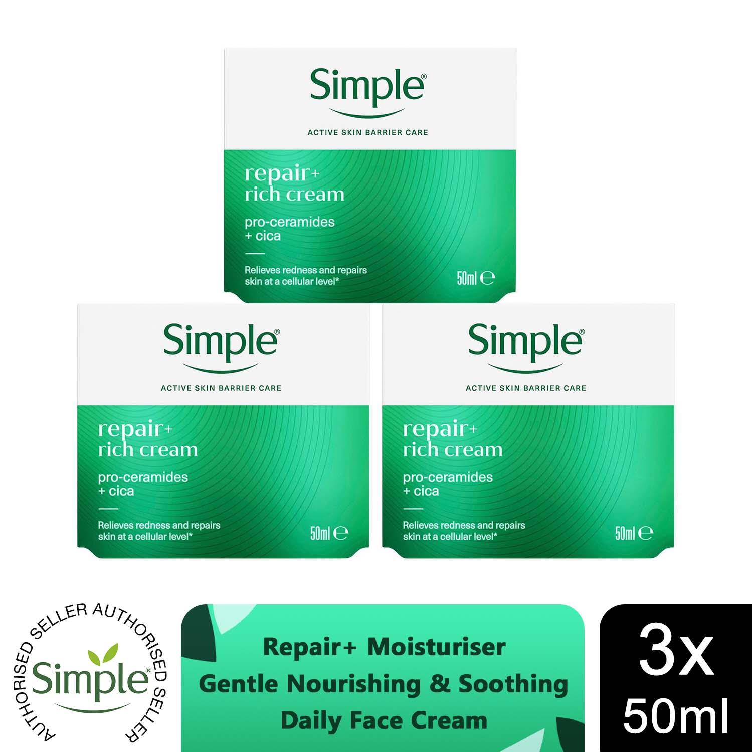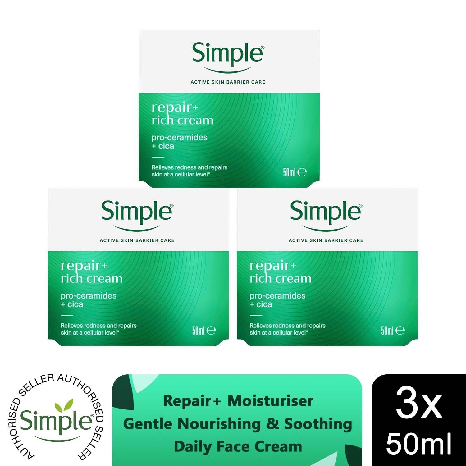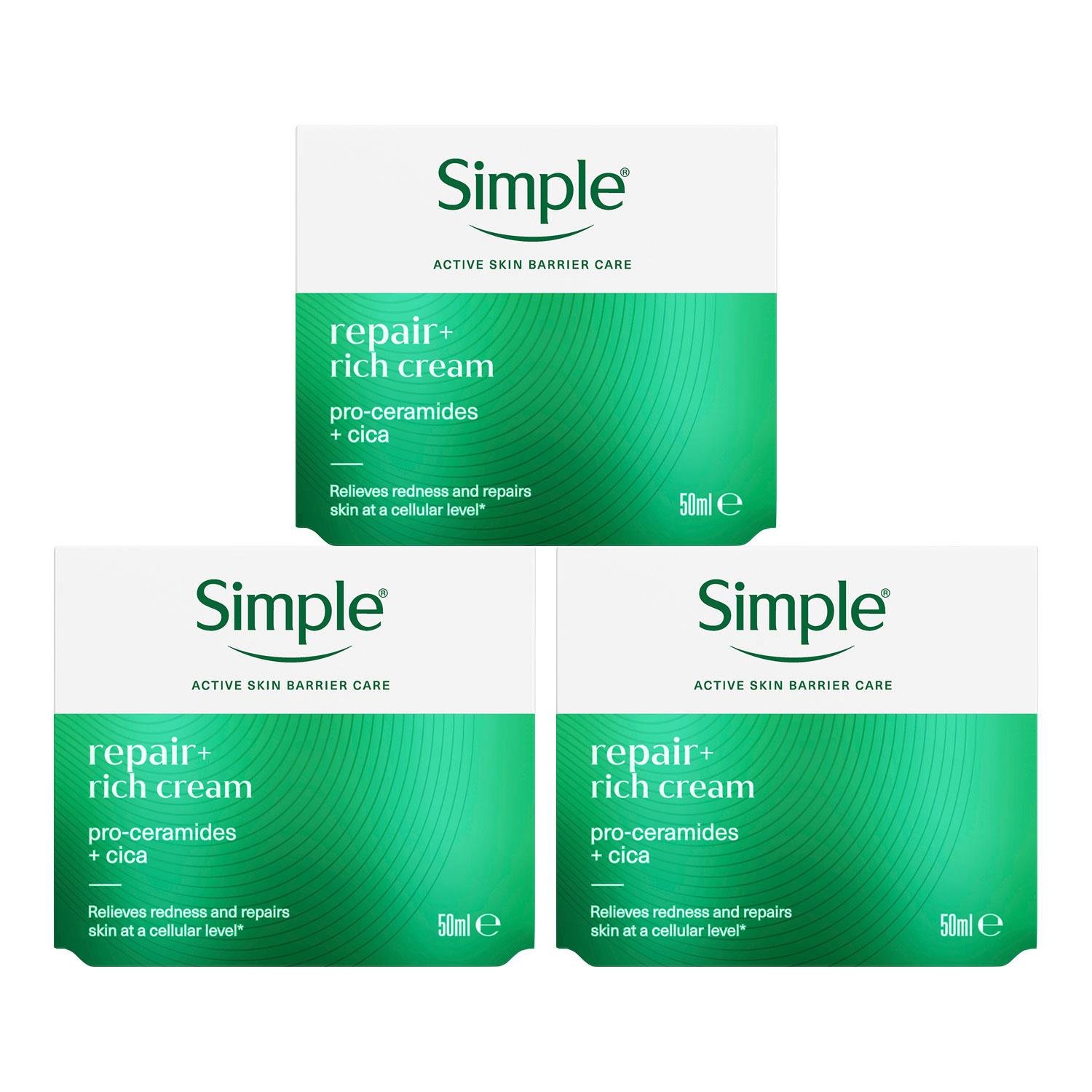 Simple Repair+ Rich Cream Soothing Hydrating Face Moisturiser 50ml, 3 Pack