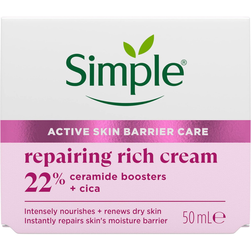 Simple Repairing Rich Face Cream facial moisturiser with 22% ceramide boosters, organic cica and provitamin B5 for a stronger skin barrier repairs and replenishes very dry, sensitive skin 50 ml