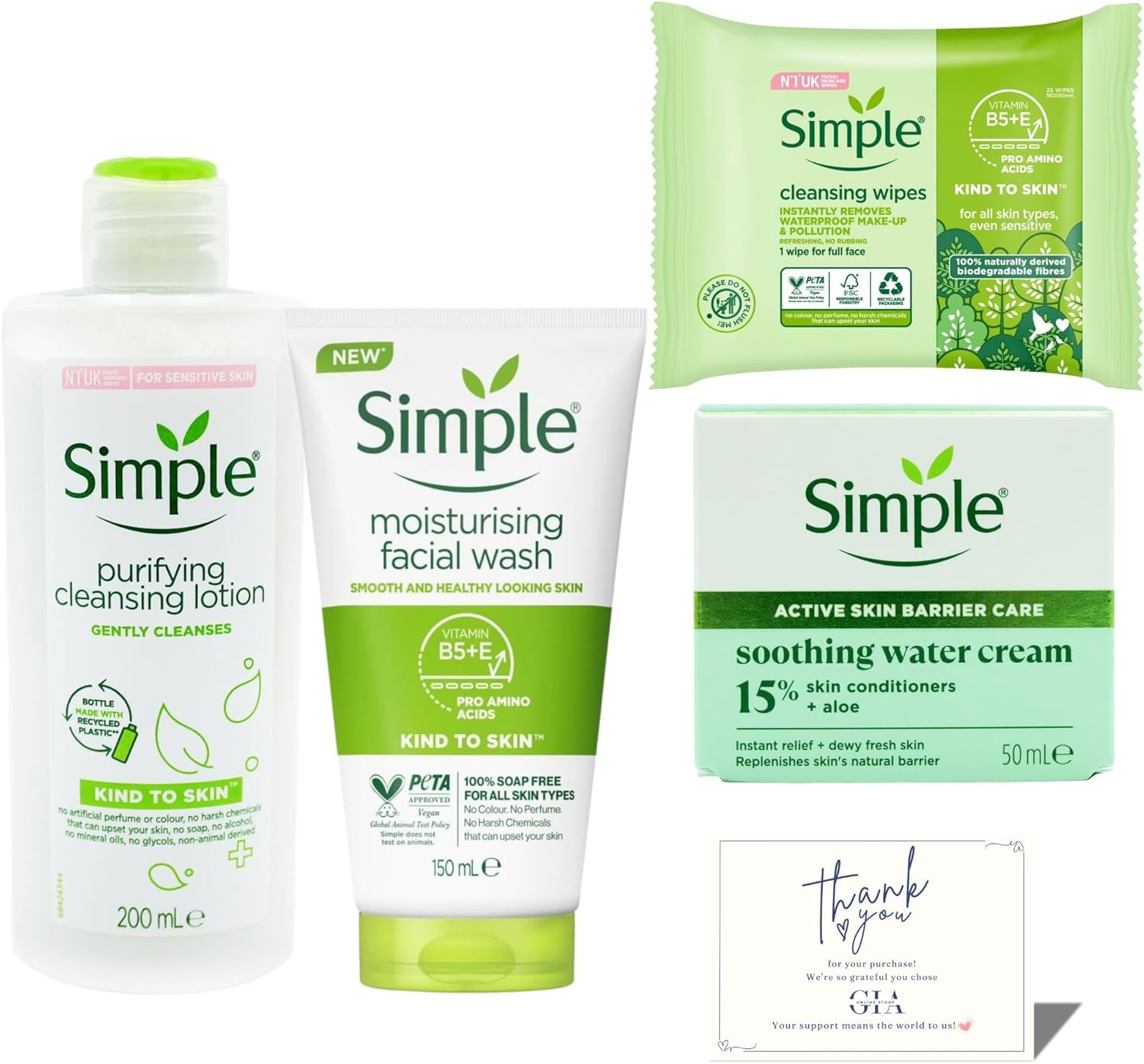 Simple Skincare Set – Simple Cleansing Lotion, Facial Wash, Face Wipes & Soot