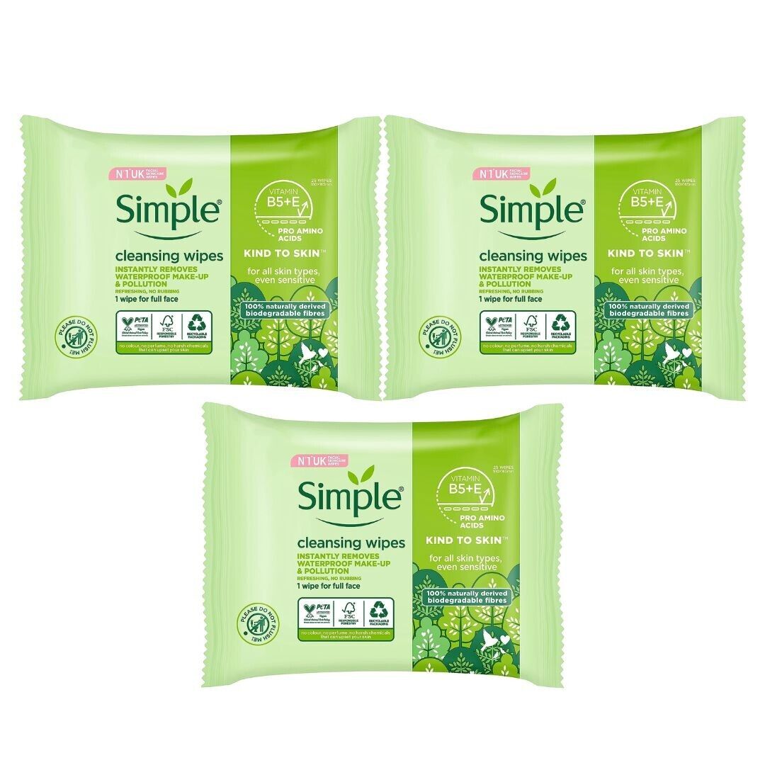 Simple Biodegradable Cleansing Face Wipes 25 Wipes x 3