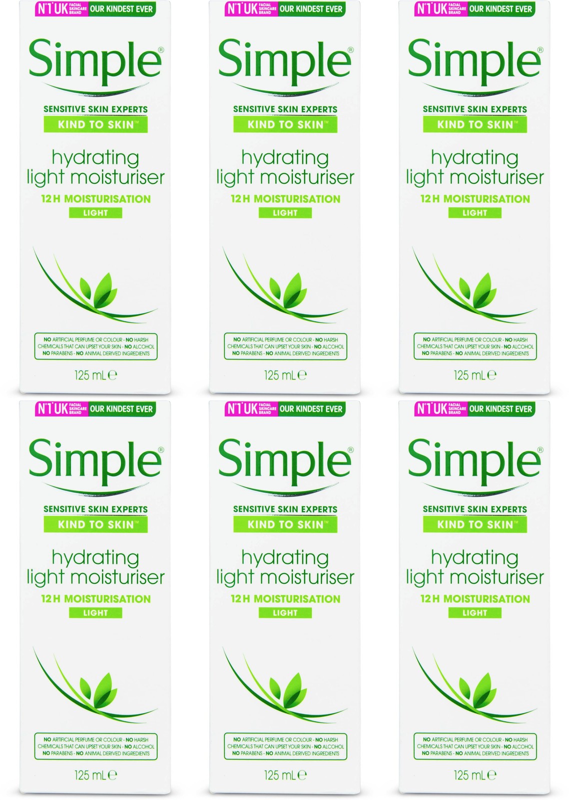 6x 125ml Simple Kind to Skin 12H Hydrating Light Moisturiser for Sensitive Skin