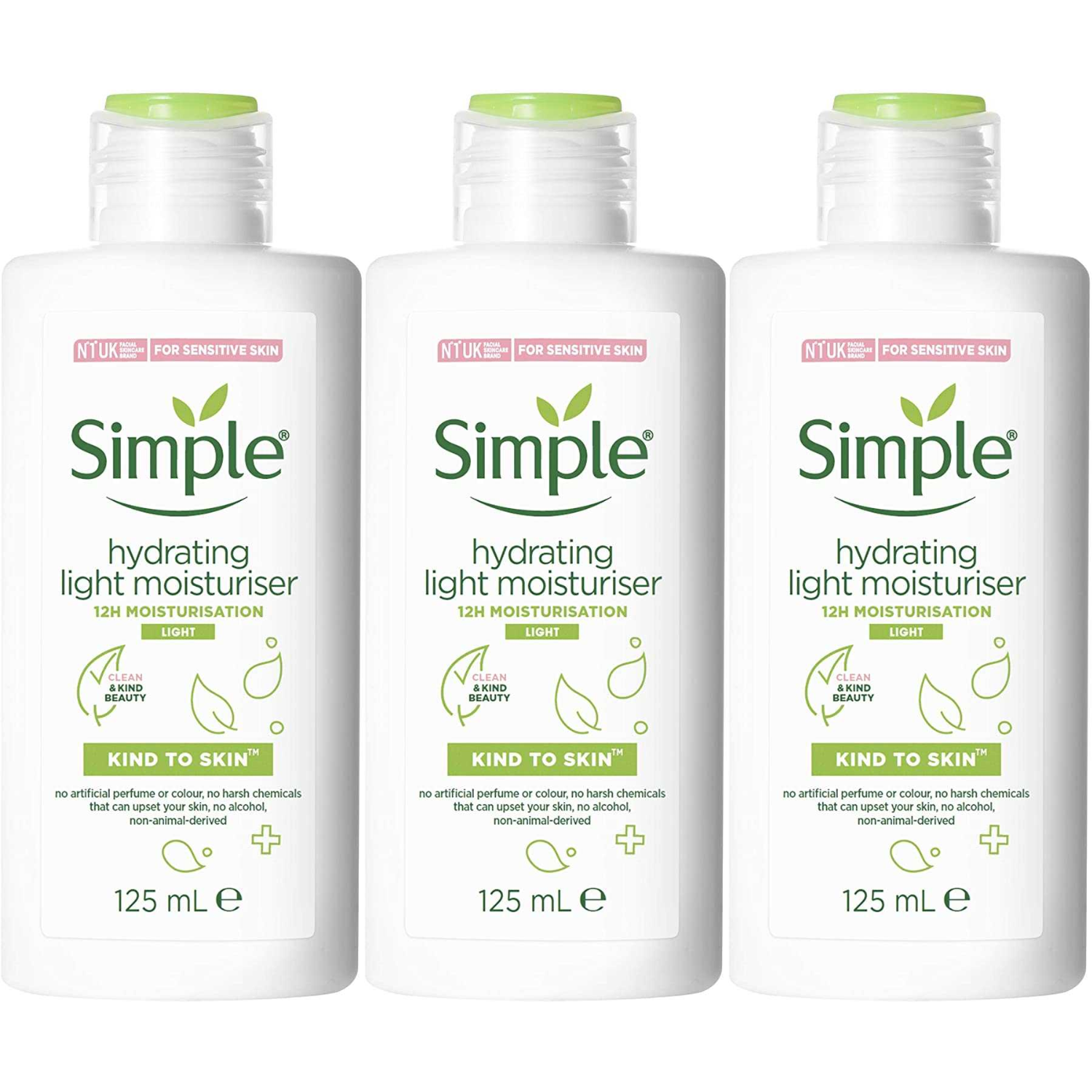 Simple (3x Light Moisture, 125ml) 3x 125ml Kind to Skin 12H Hydrating Moisturiser for Sensitive