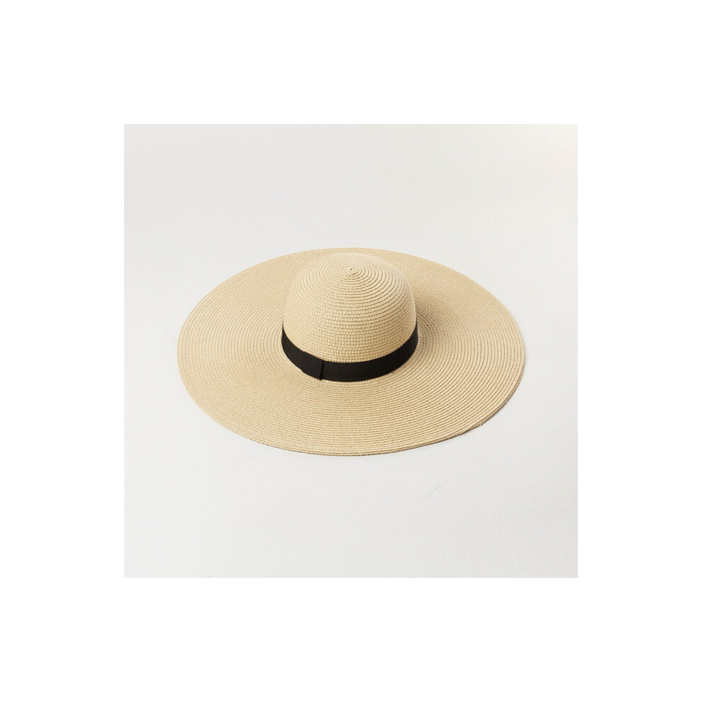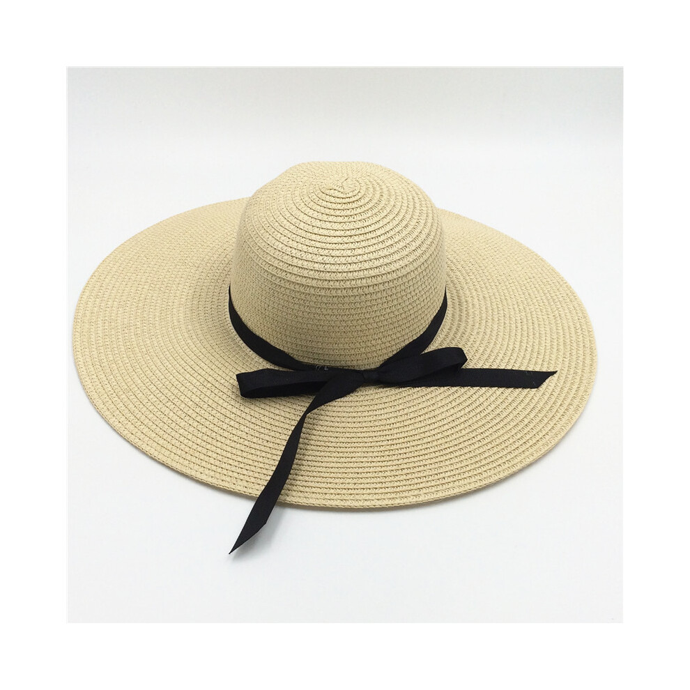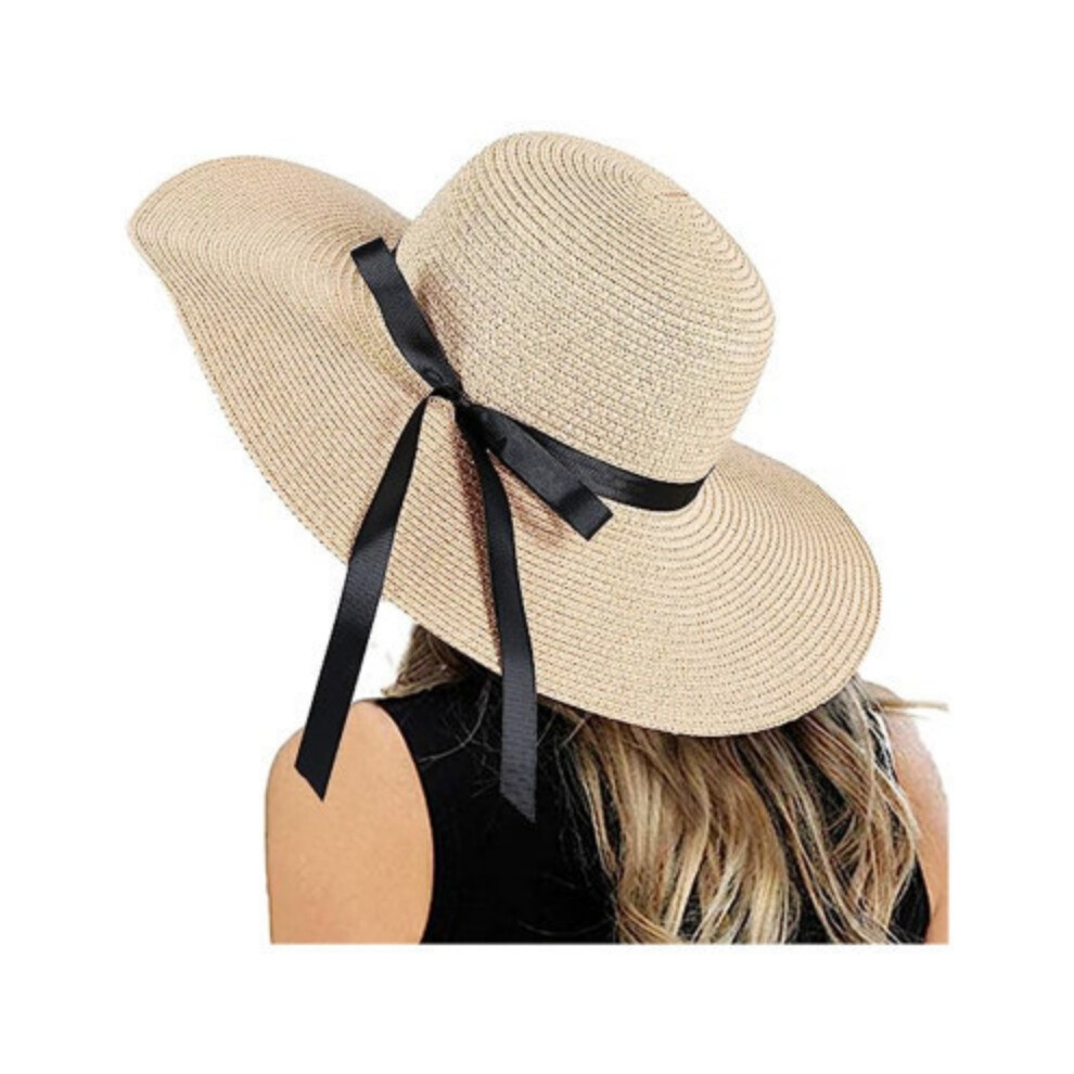 (Ribbon beige, Brim 14cm) Summer Simple Floppy Sun Hat Women Wide Brim Beach Hat Girls Seaside Travel Foldable Straw Hat Sunscreen UV Protection Lady