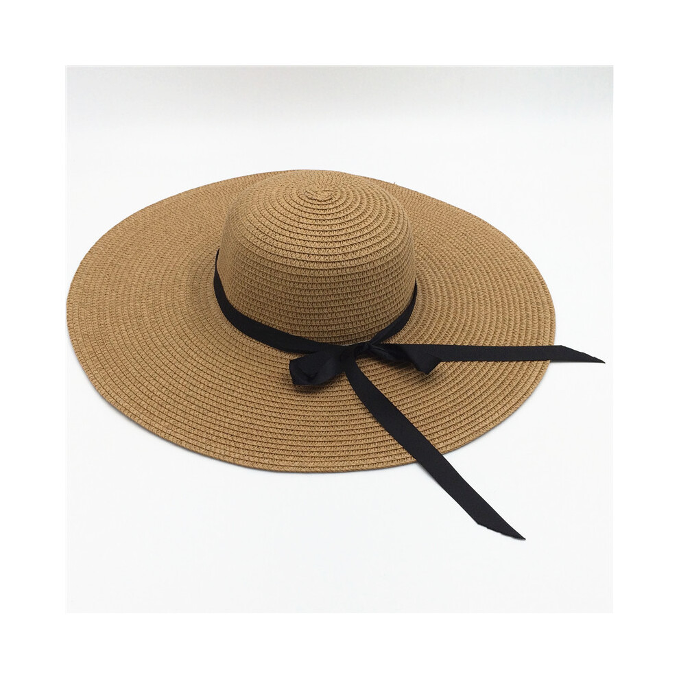 (Ribbon khaki, Brim 11cm) Summer Simple Floppy Sun Hat Women Wide Brim Beach Hat Girls Seaside Travel Foldable Straw Hat Sunscreen UV Protection Lady