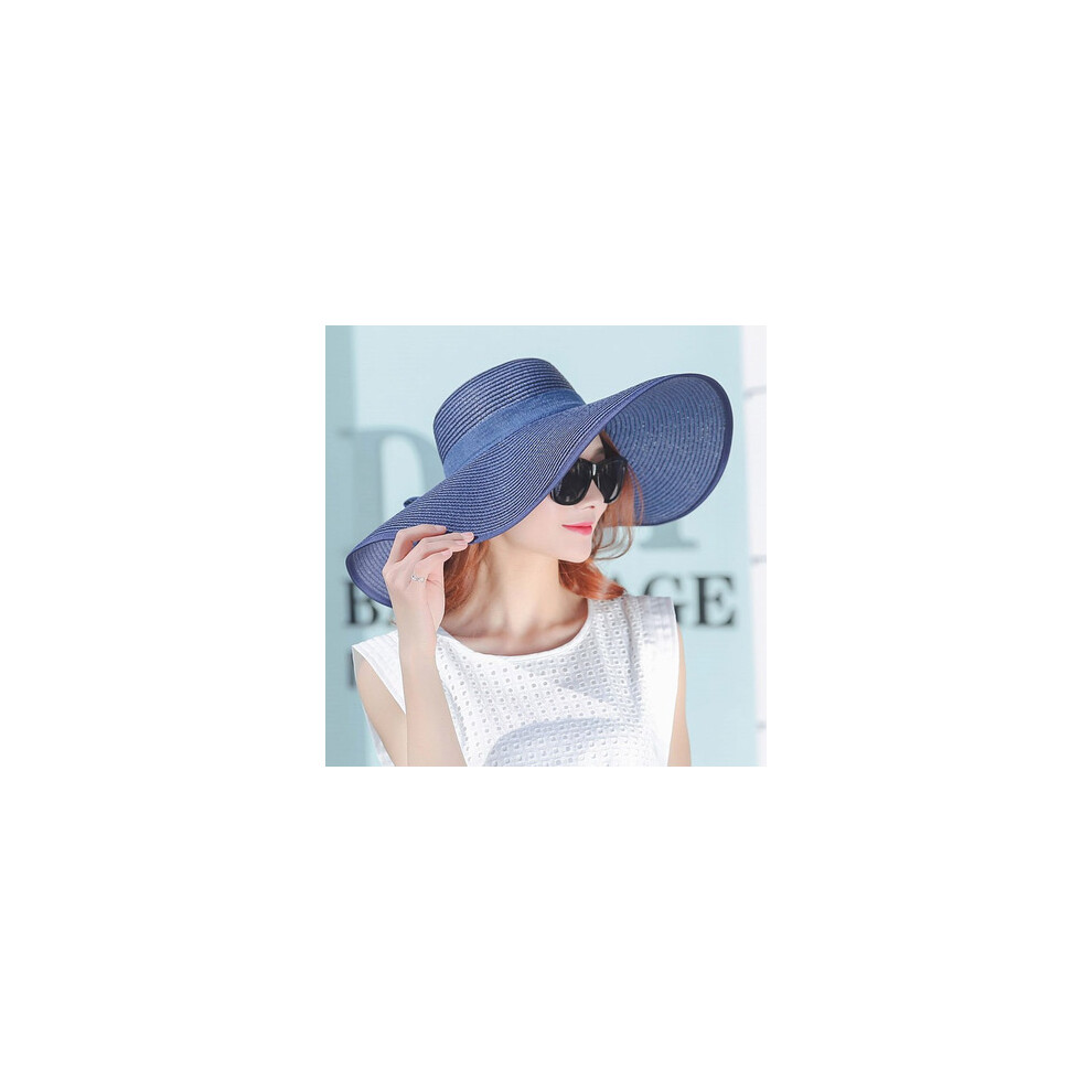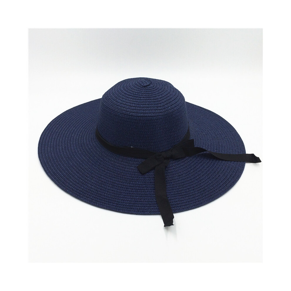 (Ribbon Navy blue, Brim 14cm) Summer Simple Floppy Sun Hat Women Wide Brim Beach Hat Girls Seaside Travel Foldable Straw Hat Sunscreen UV Protection L