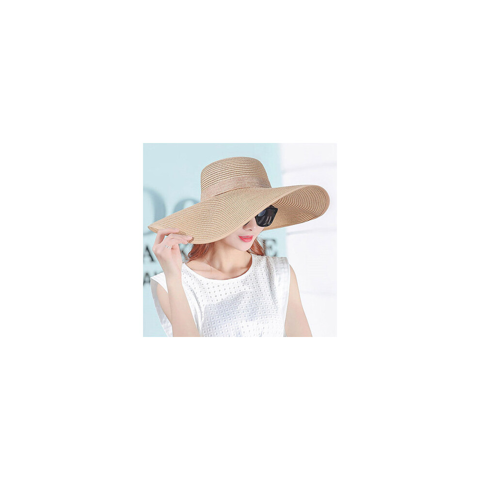 (Ribbon khaki, Brim 14cm) Summer Simple Floppy Sun Hat Women Wide Brim Beach Hat Girls Seaside Travel Foldable Straw Hat Sunscreen UV Protection Lady