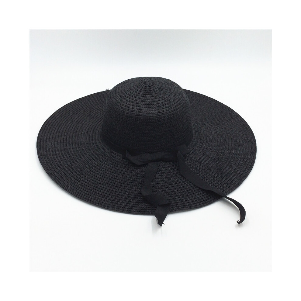(Ribbon black, Brim 14cm) Summer Simple Floppy Sun Hat Women Wide Brim Beach Hat Girls Seaside Travel Foldable Straw Hat Sunscreen UV Protection Lady