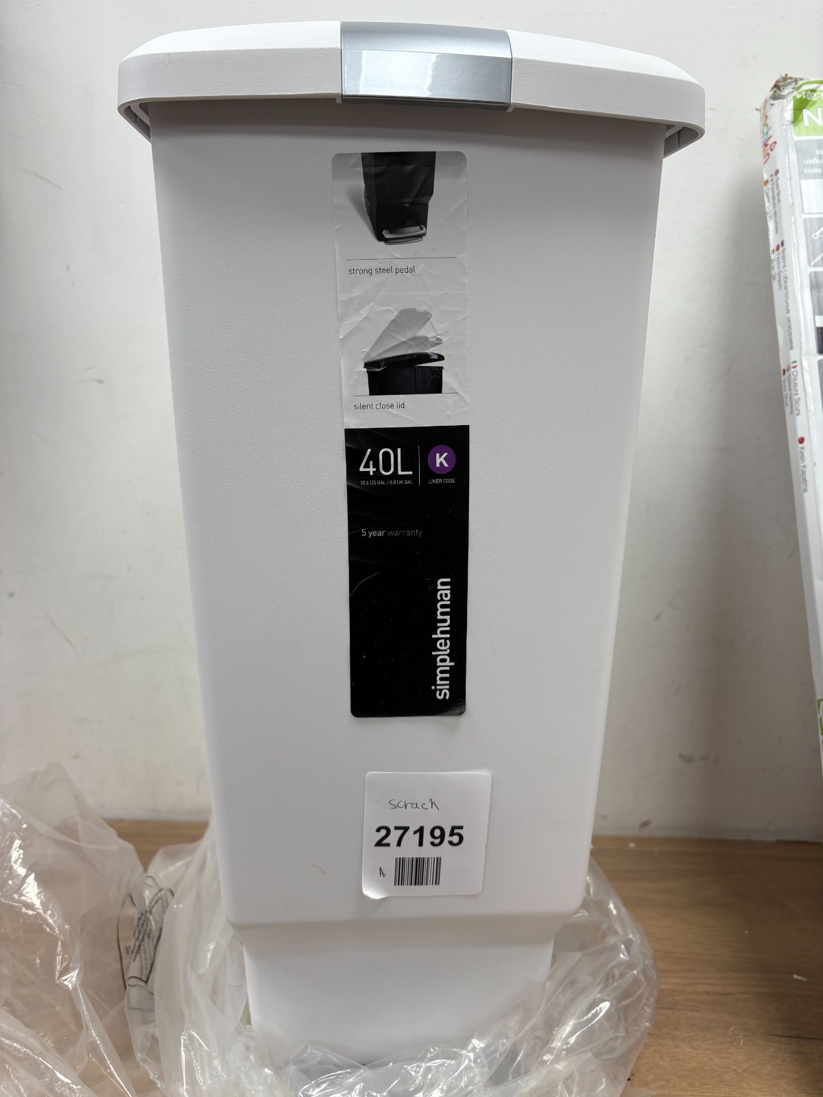 simplehuman CW1362 40L Slim Recycling Kitchen Pedal Bin with Lid Lock, Silent Soft Close Lid, Built In Wheels, Stay-Open Lid, White Plastic, W 26.0cm x H 64.0cm x D 49.0cm