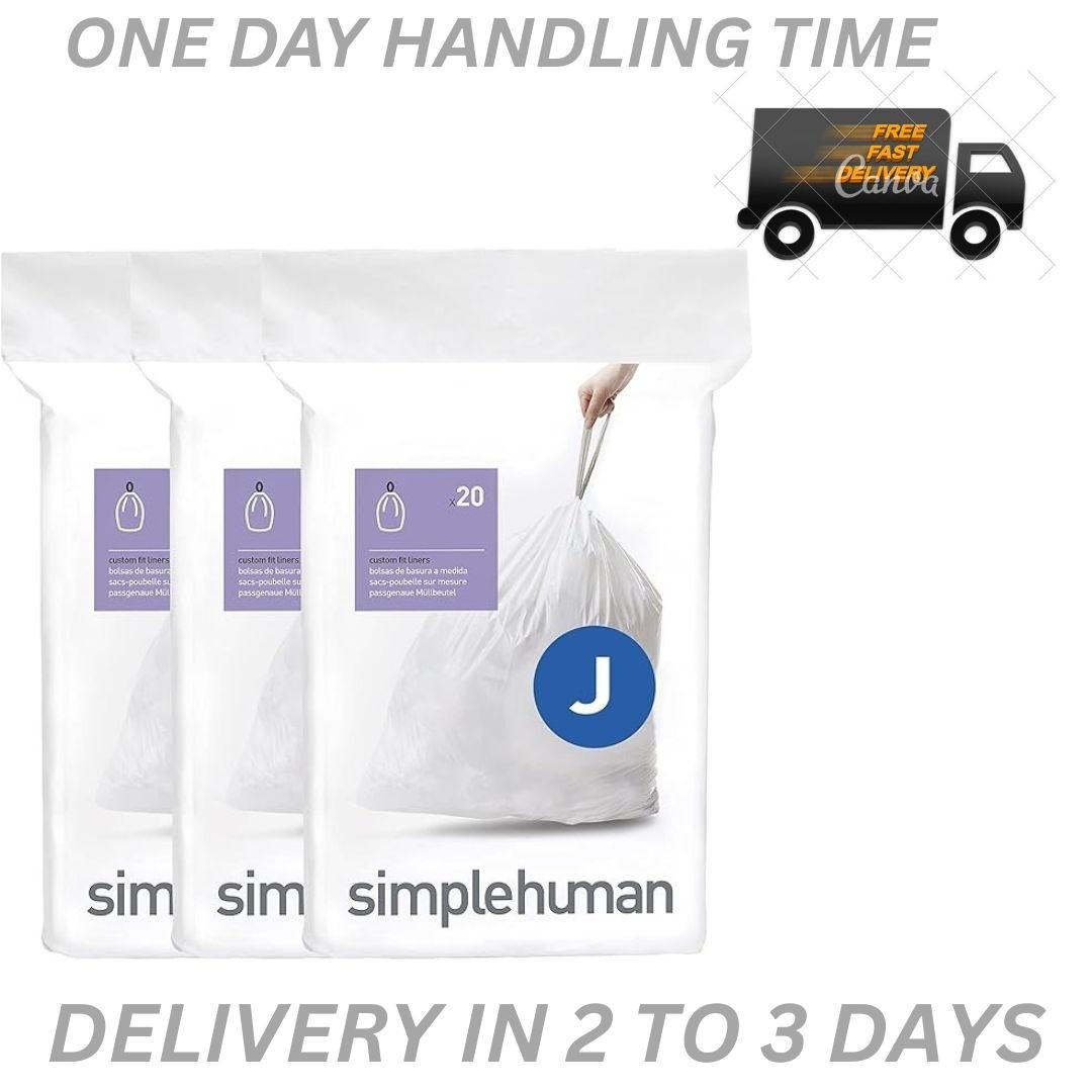 simplehuman CW0259 code J Custom Fit Bin Liner Bulk Pack, White Plastic (3 Pack of 20, Total 60 Liners)