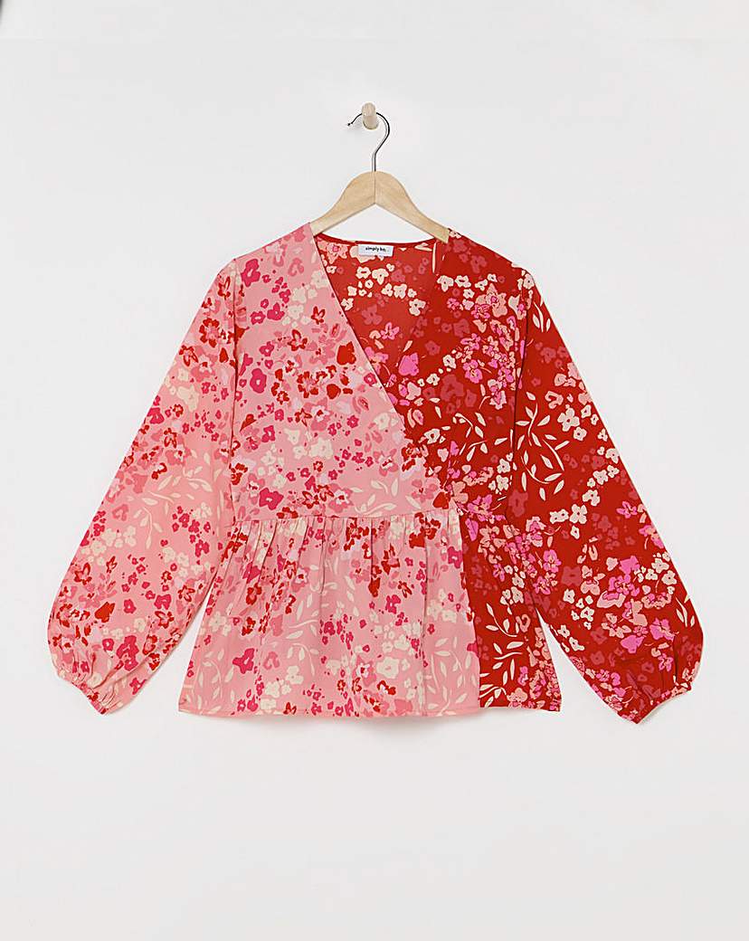 Mixed Print Wrap Peplum Blouse Pink/Red - Simply Be - Size: 10