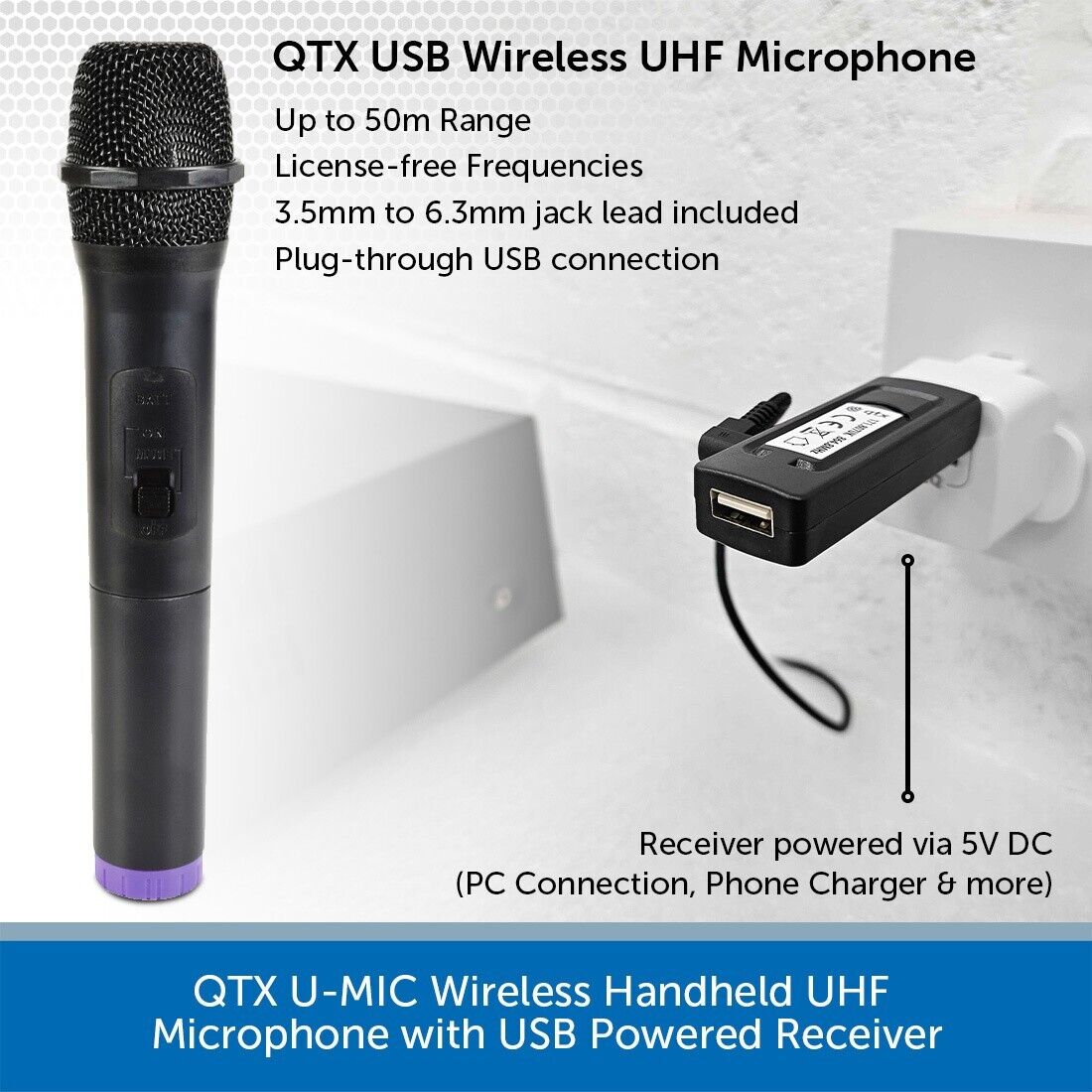QTX Wireless UHF Handheld Microphone USB Powered Dynamic Mic Singing Karakoke PA