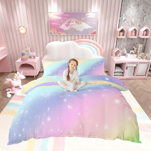Loussiesd Kids Girls Rainbow Bedding Duvet Cover Single Cute Colorful Stripes Bed Set 2 Piece Glitter Ombre Quilt Covers and 1 Pillowcases Mildly Cosy Budget Princess Bedclothes
