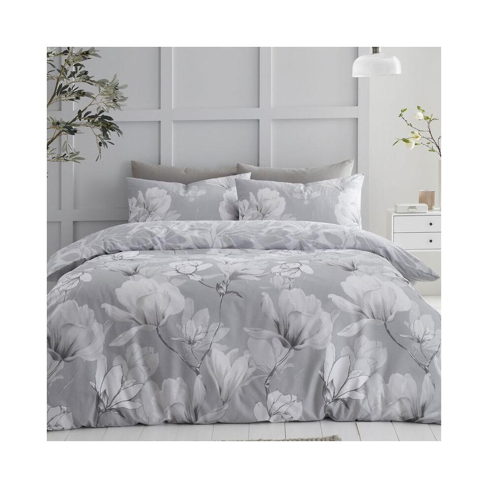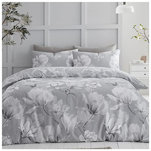(Grey, Single) Magnolia Dreams Floral Printed Easy Care Soft Duvet Cover Sets Quilt Covers Bed Set Bed Linen Reversible Bedding Sets With Pillowcases