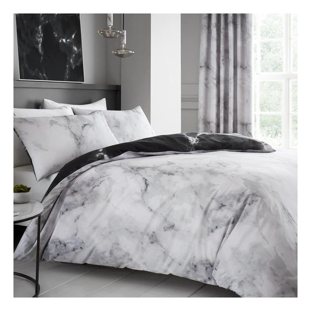Lions Marble Effect Bedding Set Single Bed Duvet Cover with Pillowcase, Ultra Soft 2 Piece Poly Cotton Reversible Quilt Covers, Button Closure, Grey,