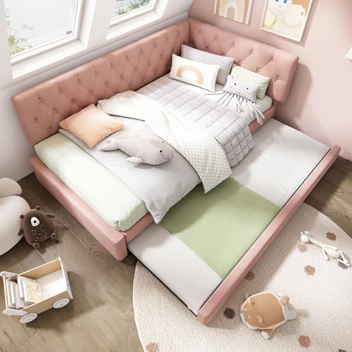 Su & Chan Legence L Shaped Corner Bed Frame with Trundle, Velvet Coener Sofa Bed with Slatted Frame, Pink Single Bed, Pink Trundle Bed, 90x190cm