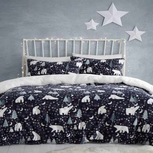 Fusion Christmas Duvet Cover – Single Size (140 x 200cm) – Starry Night & Polar Bear Design – Reversible – Navy Blue Festive Bedding with Arctic Bears & Trees – Includes 1 Pillowcase