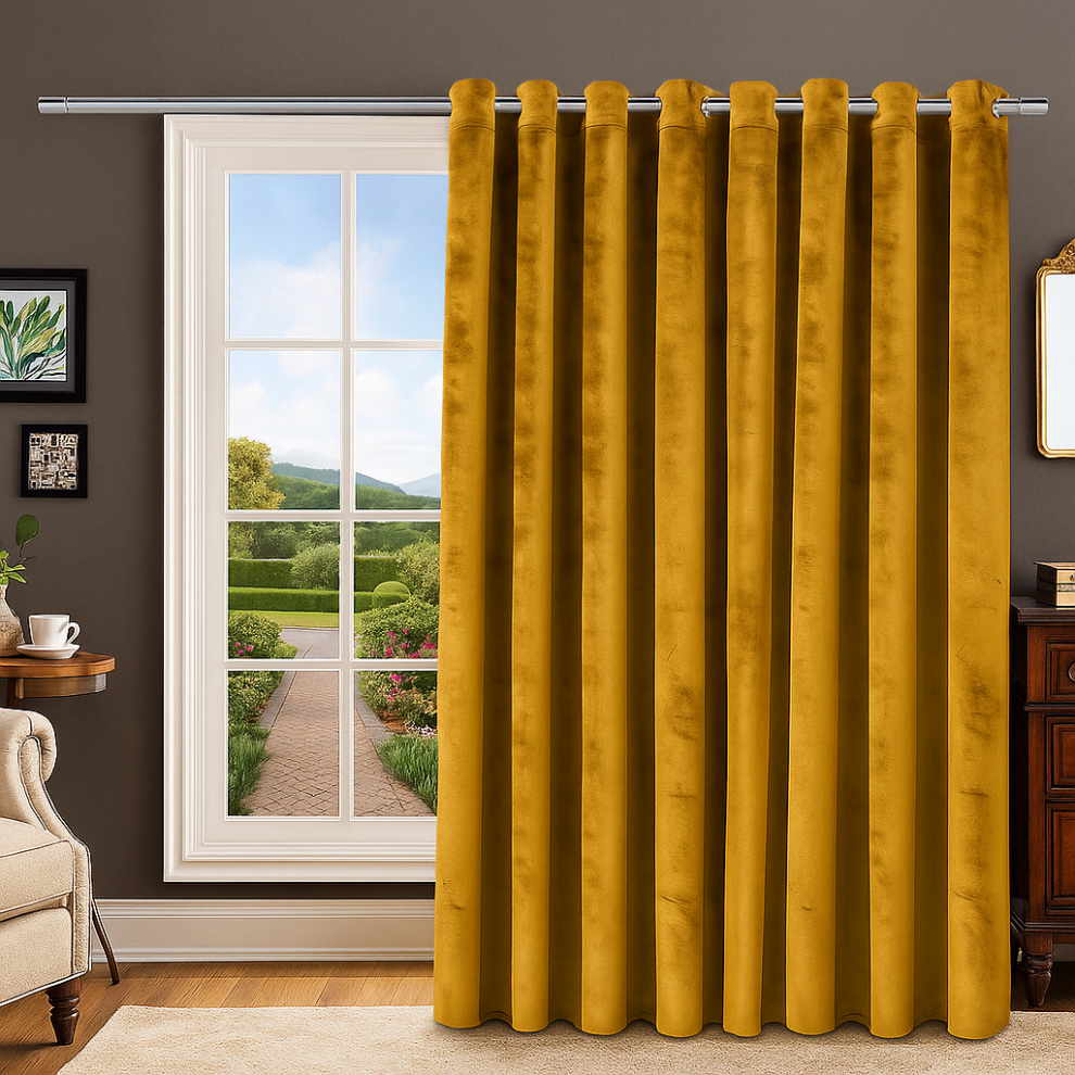 (Ochre, 66 x 84 in (5.5ft x 7ft) - Single Panel Door Curtain) Crushed Velvet Eyelet Curtains - Readymade Lined Drapes for Bedroom & Living Room