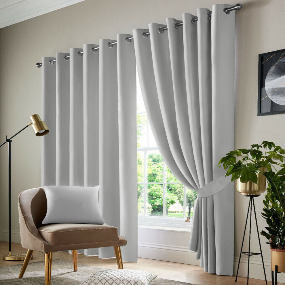 (Silver, 66'' x 84'' (SINGLE DOOR CURTAIN)) BLACKOUT EYELET CURTAINS READY MADE PAIR+2 TIEBACK
