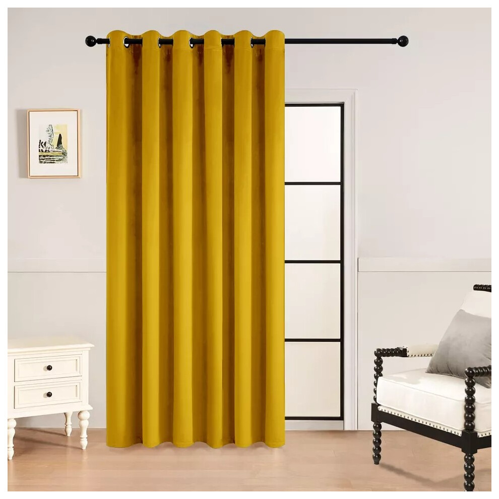 (Velvet Ochre) Blackout Door Curtain Velvet Embossed & Plain Single Panel Door Curtain with Tie Back