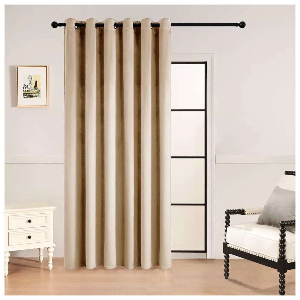 (Plain Beige) Blackout Door Curtain Velvet Embossed & Plain Single Panel Door Curtain with Tie Back