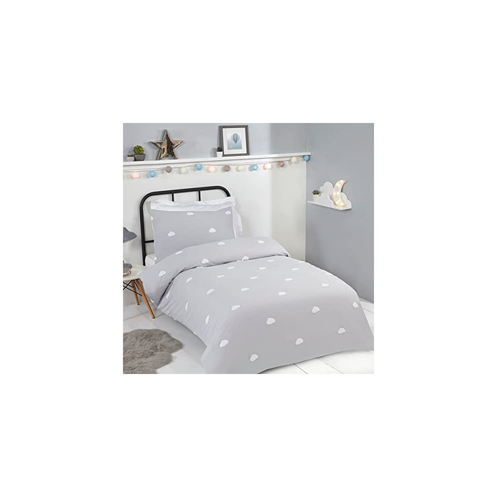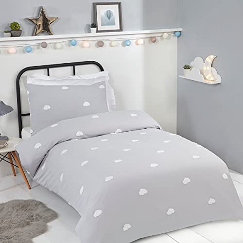 Sleepdown Tufted 3D Clouds Kids Boys Girls Childrens Grey White Soft Cosy Easy Care Duvet Cover Quilt Bedding Set with Matching Pillowcase-Single (135cm x 200cm), Polyester