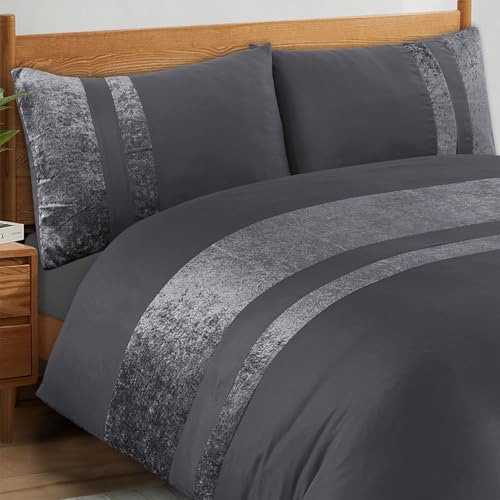 Casabella Luxury Crushed Velvet Panel Band Duvet Cover Sets with Pillow Case Single Duvet Cover Bedding Set – Grey Crush Velvet Single Duvet Cover Sets