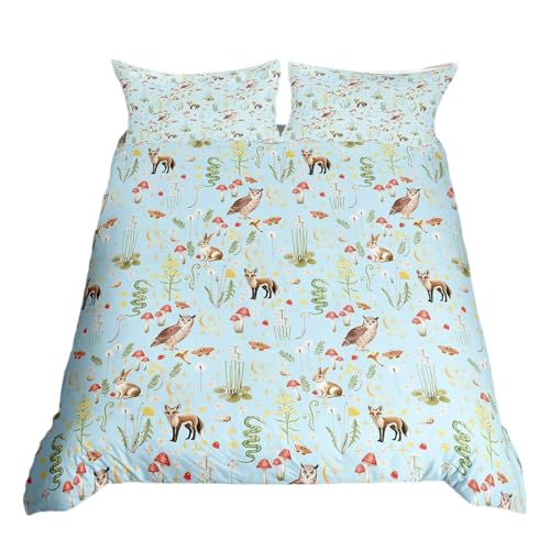 Homewish Woodland Single Duvet Cover Sets Microfiber Reversible, Aesthetic Floral Bedding Set for Girls Women Bedroom Decor, Cute Owl Rabbit Fox Pattern Bedding, Rustic Blue Bed Sets, 1 Pillowcase