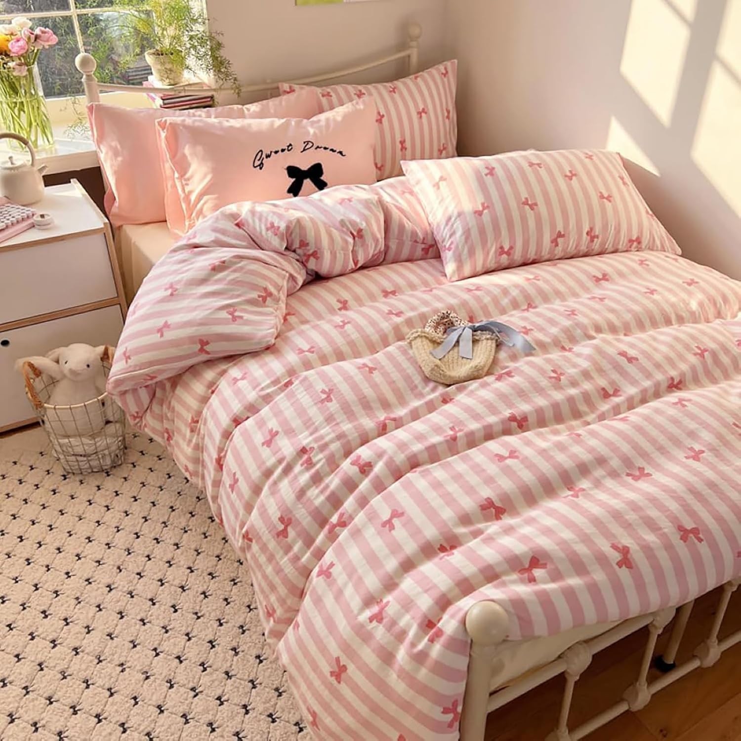Girls Kids Striped Bow Tie Reversible Bedding Single Duvet Cover Sets Bed Zippe