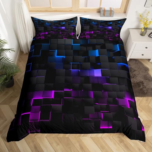 Homewish Geometric Checkered Single Size Duvet Cover Sets, Modern Cube Design Bedding Set for Kids Boys Girls Adults, Purple and Blue Grid Print Quilt Cover Futuristic Gradient Bed Set