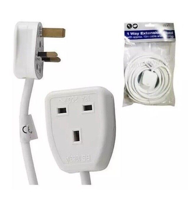 One Socket Single Extension Lead, Unswitched, 10 Metre Cable, 1-Way Plug Extensi