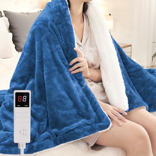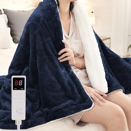 BOMOVA Electric Heated Blanket Single Throw (130x160cm,Blue)-Flannels Fleece Winter Warm Blanket,10-Level Heating & 5 Auto Timer,Cozy Sofa Throw for Home Office,Xmas House Warming New Home Gifts